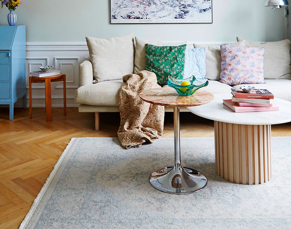 Hvis du går efter et sofabord med sten- eller marmorbordplade, kan du bløde det op med tekstiler, så rummet ikke føles så "koldt".