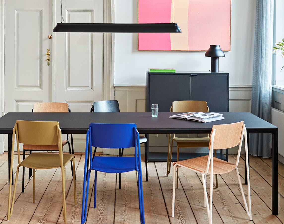 Miks dine yndlingsstole rundt om spisebordet. De behøver ikke være i samme stil, farve eller materiale – jo mere forskellige de er, des mere sanseligt udtryk får rummet. Hvis du samtidig vil have et helstøbt udtryk, kan du holde dig til farver, som matcher den øvrige indretning. Lad også dine stole stå mere tilfældigt rundt om bordet, så du får forskellige udtryk og vinkler frem, hver gang du placerer dem. Samtidigt undgår du også, at stuen ser meget stringent ud, hvis du har mange firkantede møbler. Foto: Klaus L. Møller.
