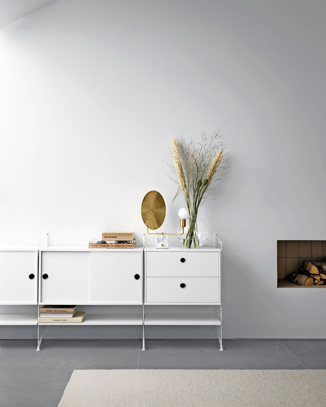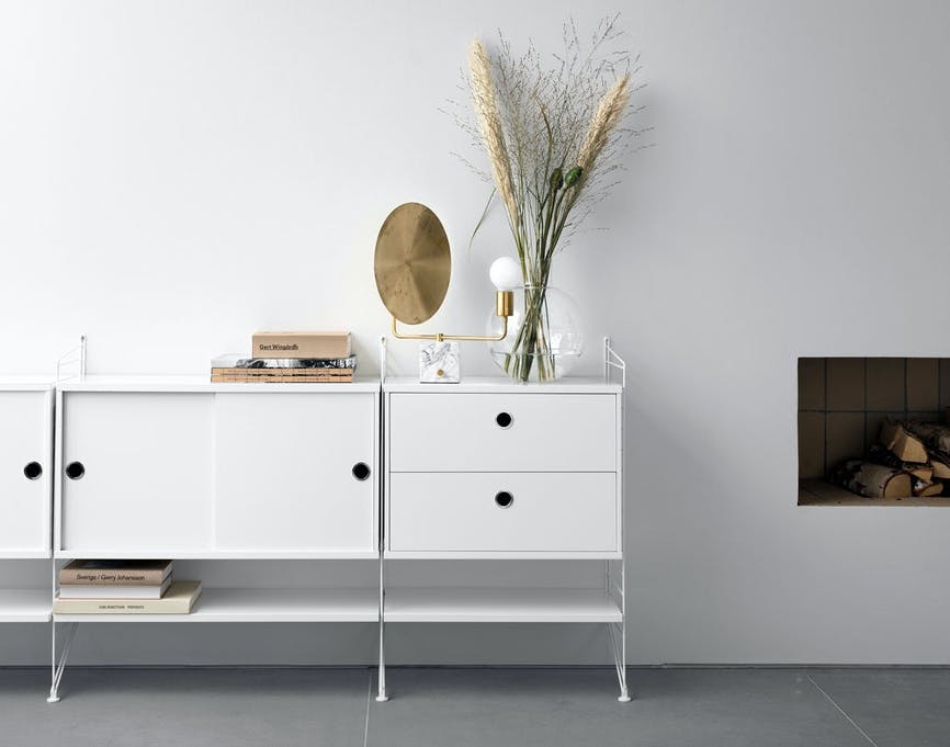 Et reolsystem er perfekt som tv-møbel, da det både er stilrent og praktisk på samme tid. Dette er "string system" fra String Furniture.