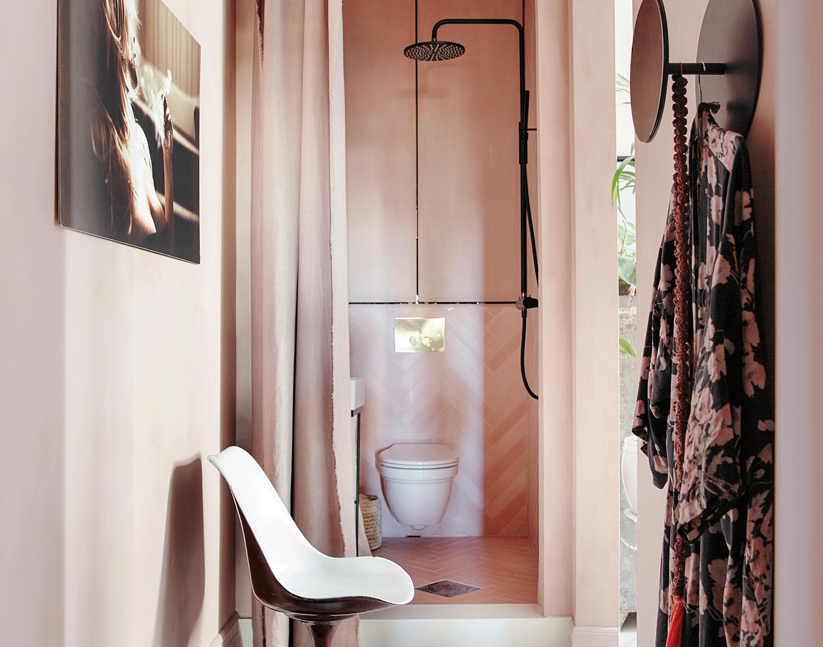 Det kan måske virke skræmmende med et helt lyserødt badeværelse, men fantastisk ser det ud. Alternativt kan du bruge grå eller blå nuancer.