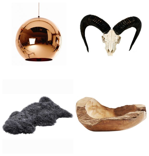 Kobberpendel designet af Tom Dixon. Køb den her! (link fjernet) Smuk vildtdekoration til væggen. Langhåret fåreskind, der egner sig perfekt til den nordiske bolig. Køb det her! (link fjernet) Rustik frugtbowle til spisebordet. Køb den her! (link fjernet)