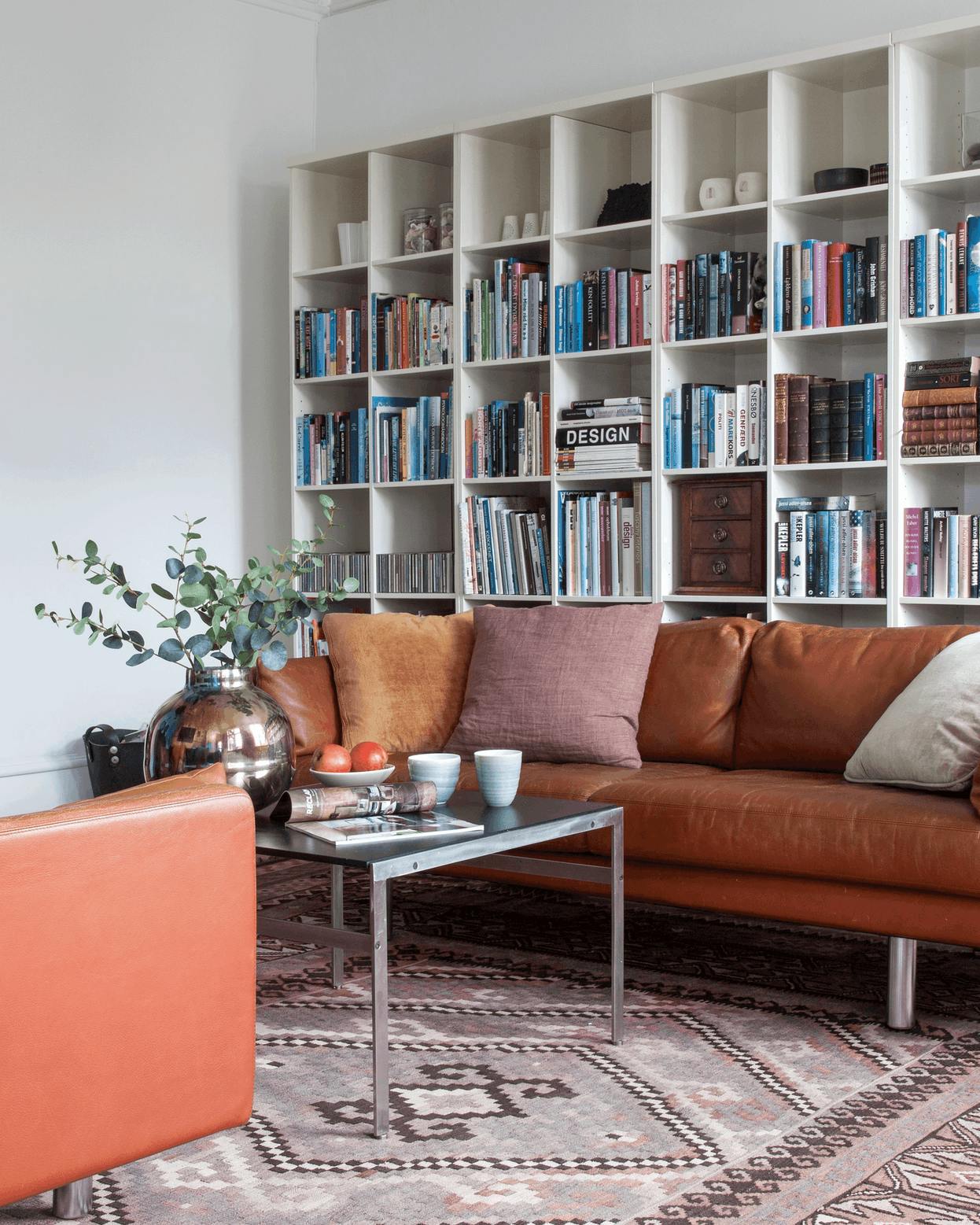 Selvom du vælger en indbygget reol til stuen, så kan du stadig udnytte pladsen foran den til små møbler som fx her, hvor Safari-stolen passer perfekt ind i hjørnet foran reolen. Hvis du vil undgå, at det ser for rodet ud, så vælg skabe nederst i din reol, der kan gemme rod væk.
