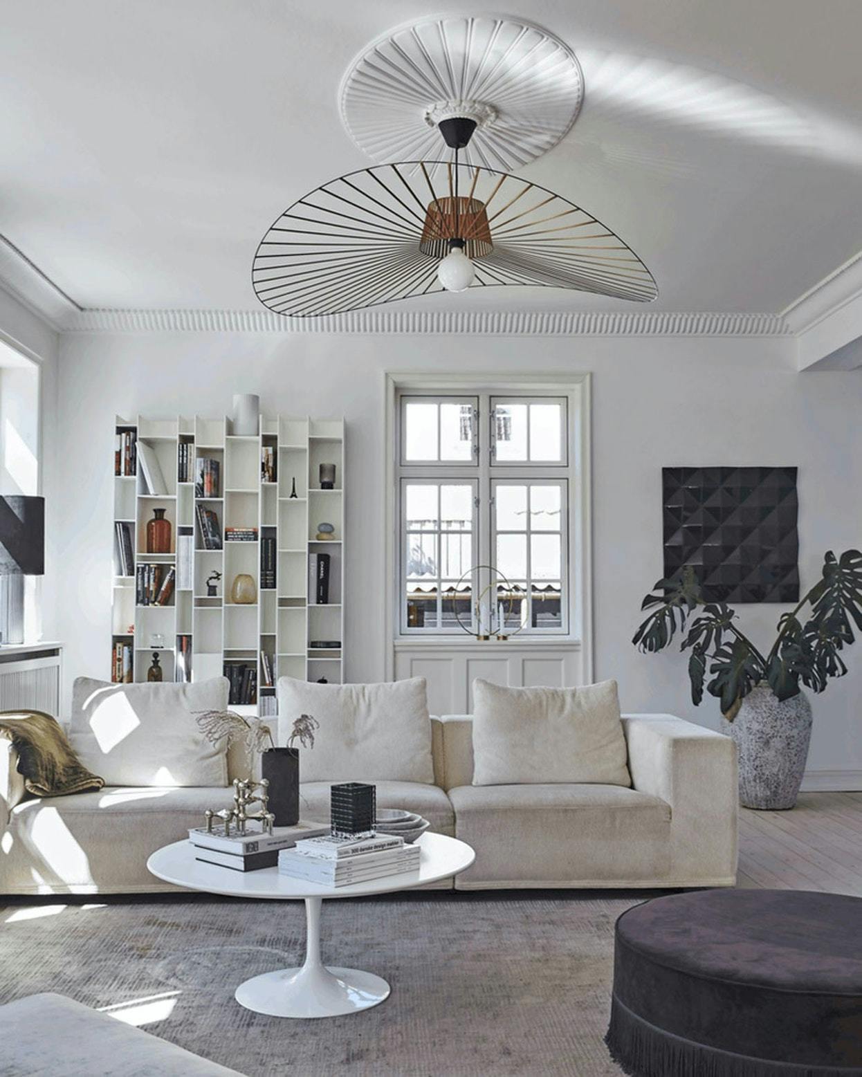 Her er der plads til fordybelse og afslapning. Den store bogreol med bøger og vaser tilfører rummet personlighed, og ved ikke at lade den gå helt op til loftet og deruodver placere bøgerne i de nederste rum, bliver der skabt fokus på det hyggelige sofaarrangement.