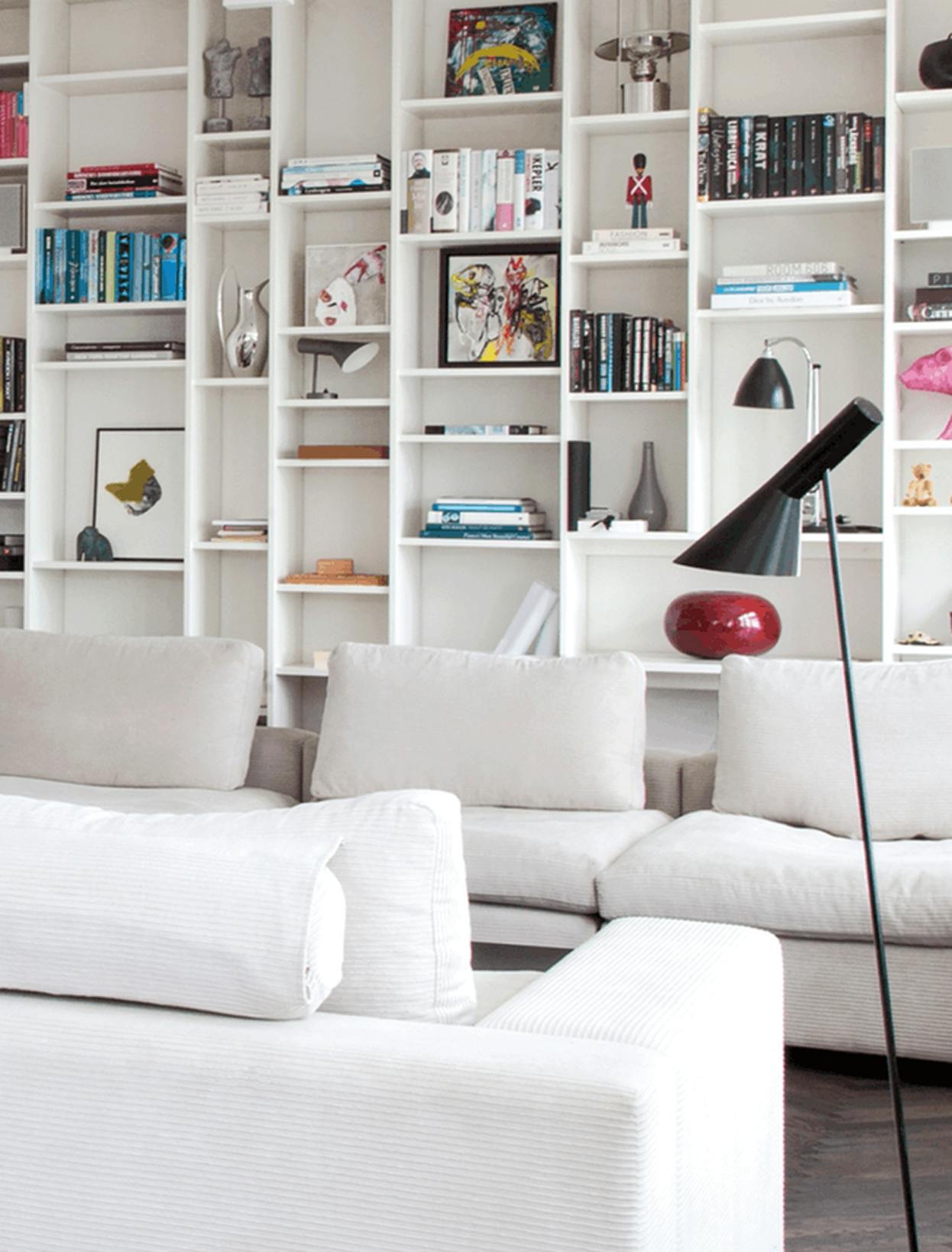 Når du lader din bogreol gå helt op til loftet, danner den en integreret væg, som både hygger og gør plads til opbevaring. Gør gerne plads til at lidt større ting såsom lamper kan blive vist frem.