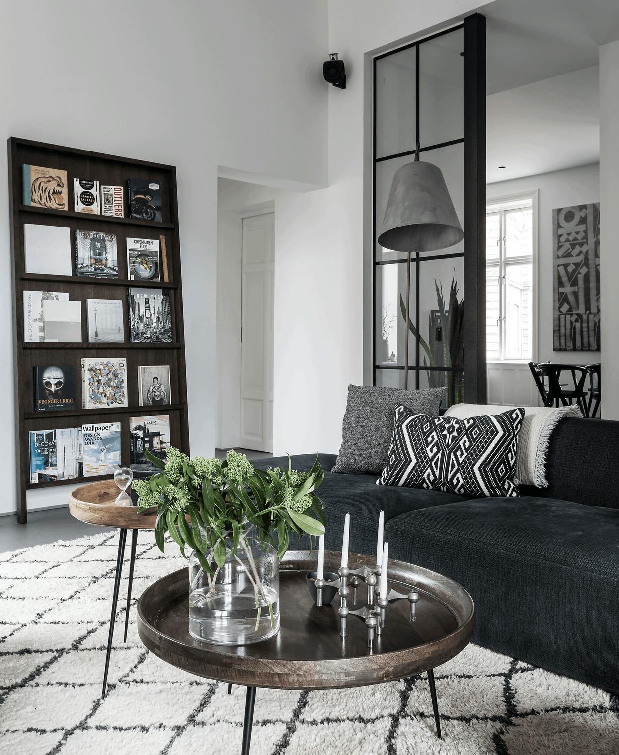 Skab et råt udtryk i din stue ved at lade den mørke farve fra reolen gå igen på flere af dine møbler. Har du mange fine coffee table books, kan du med fordel vælge en reol, hvor bøgerne kan udstilles, så de er med til at skabe personlighed i stuen.