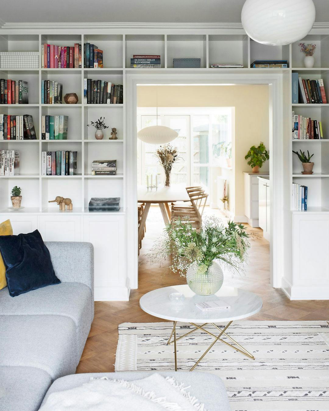Reolen her er bygget af parret, der bor i huset, så den passer præcis til stuens ene væg. Reoln har plads til både bøger, æsker, vaser og lamper, uden det kommer til at se kompakt ud - og så danner den ramme om et skønt kig ind til spisestuen.