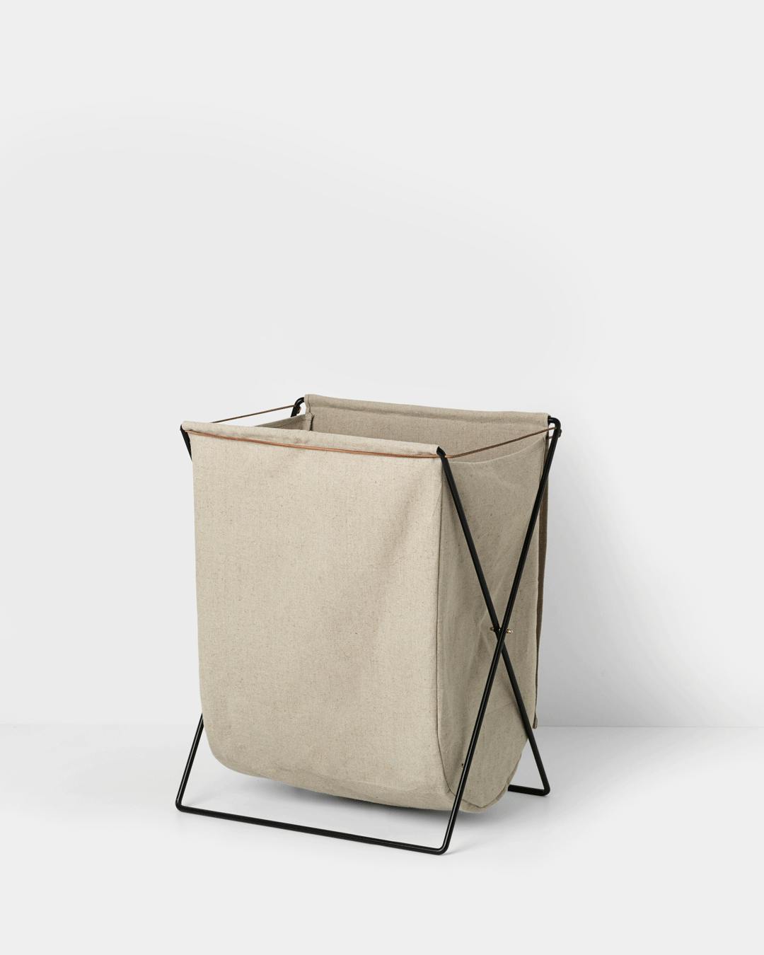 Ferm livings vasketøjskurv er både klassisk og minimalistisk med sin beigefarvede vasketøjspose.