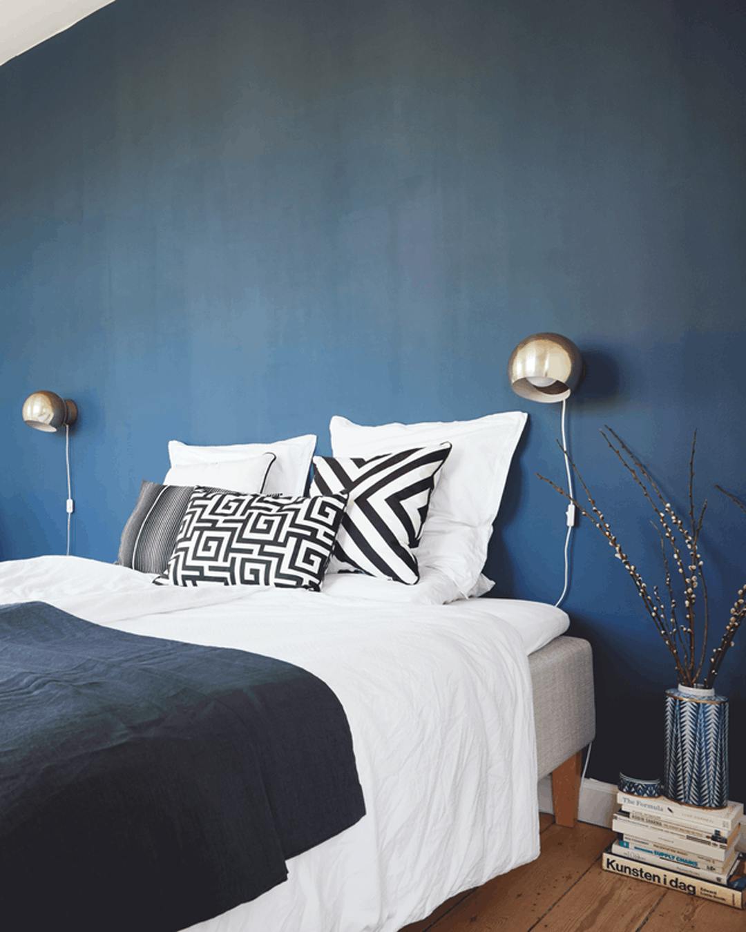 Mal hele bagvæggen i en kraftig farve i stedet for en sengegavl, hvis du vil have samme effekt med at ramme din seng ind, men gerne vil skifte udtryk lidt oftere. Blåt giver et køligt, roligt udtryk, mens de messingfarvede lamper giver lidt varme til rummet.