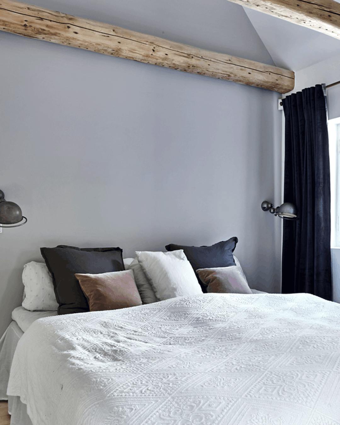 Følelsen af et frisk, lyst rum kan være rart, når du skal sove, men det er også dejligt at putte sig ned i en lun hule. Den skaber du ved at bruge støvede farver og gerne som her male både sengegærde og væg i samme farve. Læg desuden mærke til en anden måde at arrangere puder ved at stable dem i højden.