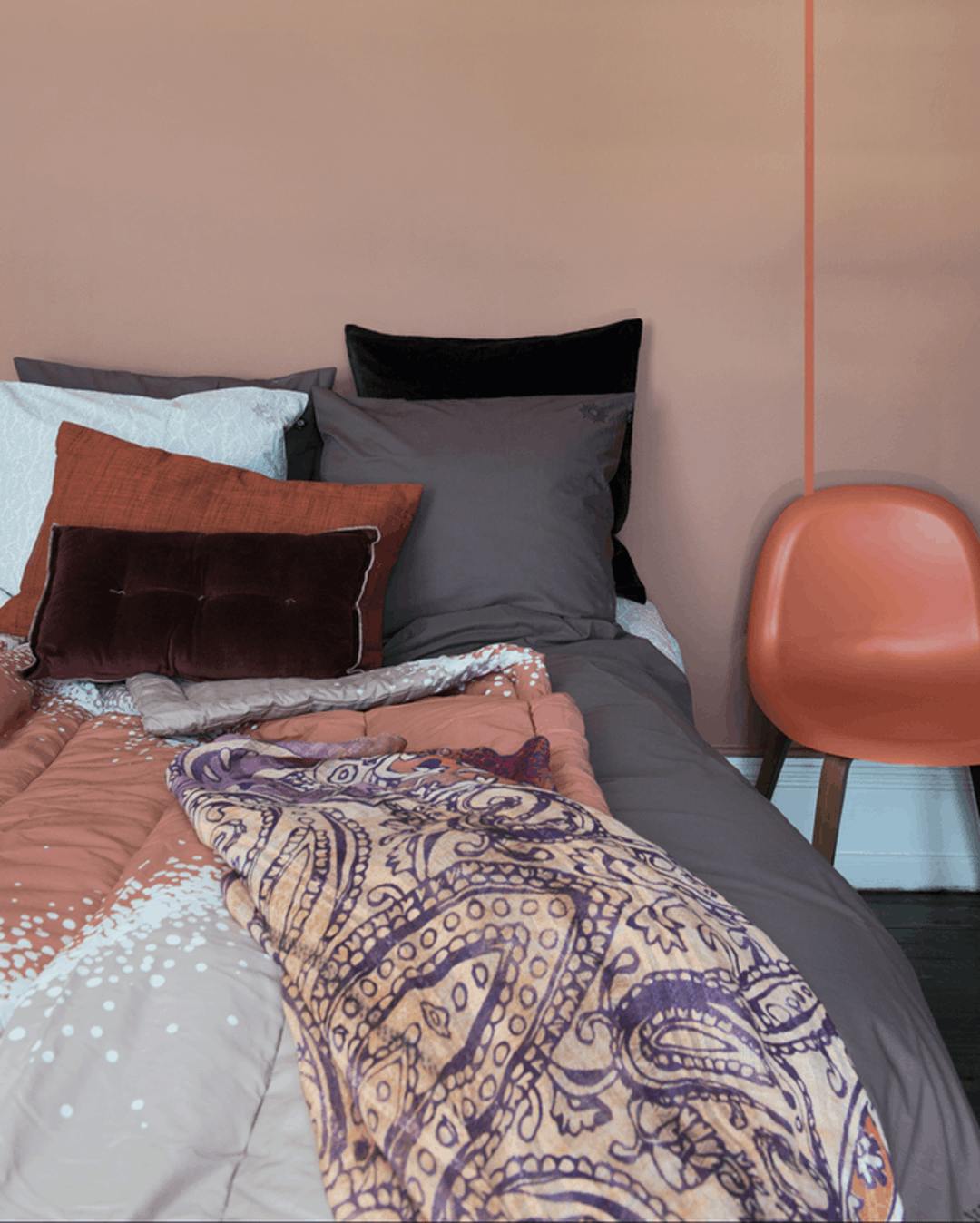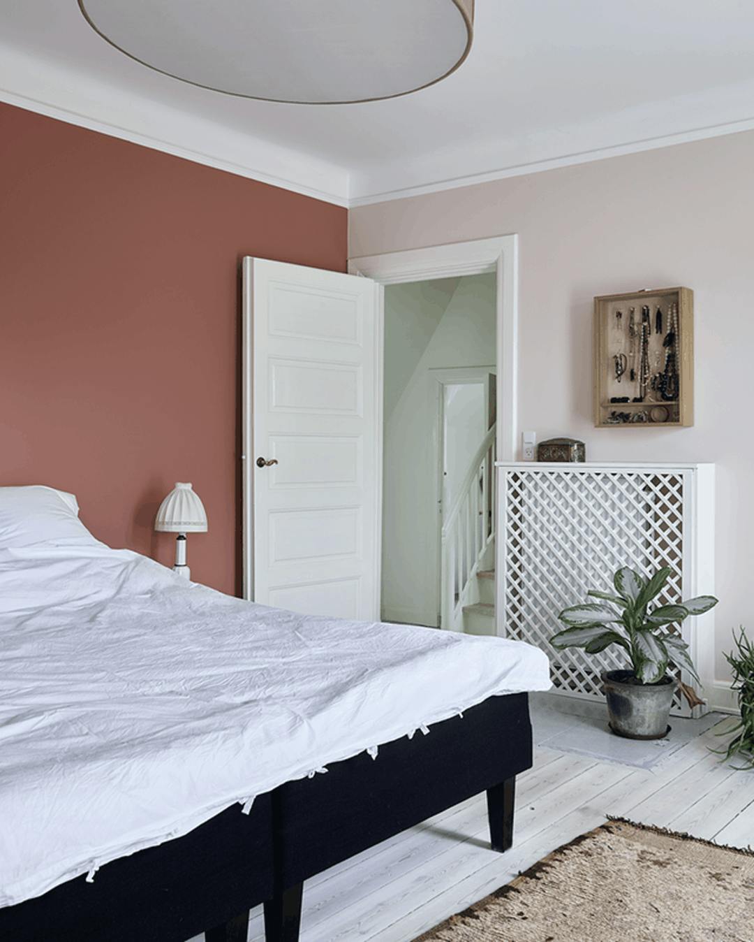 Har du mod på at eksperimentere med indretningen i soveværelset, kan du som her bruge nogle af de farver, der er fremme på boligfronten lige nu. Også hvis det er varme farver. Mens de populære blå, grå og hvide nuancer giver en kølig fornemmelse, er brændte toner med til at give dit soveværelse karakter og hygge.