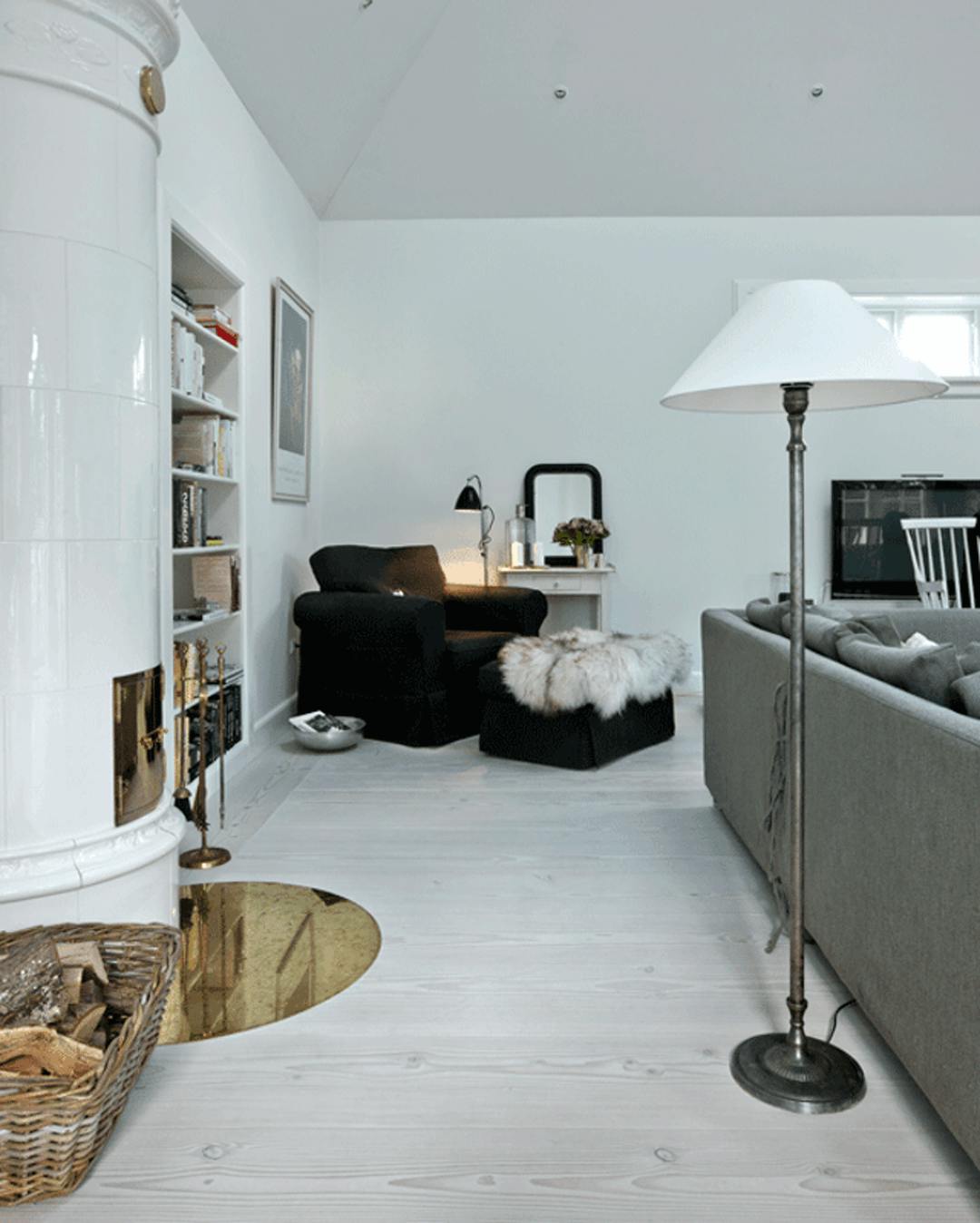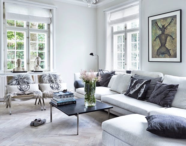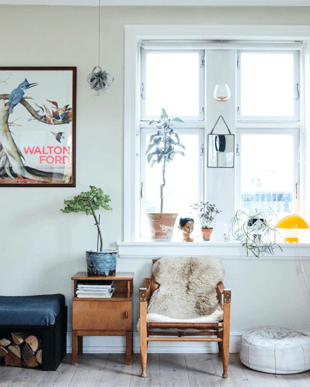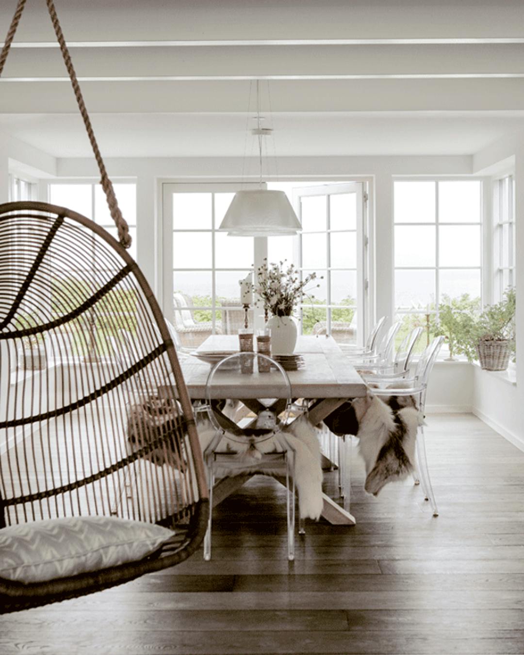 Hvide rammer, skind, en hængestol i flet og uendeligt meget lys. Denne stue rammer plet på den nordiske stil.