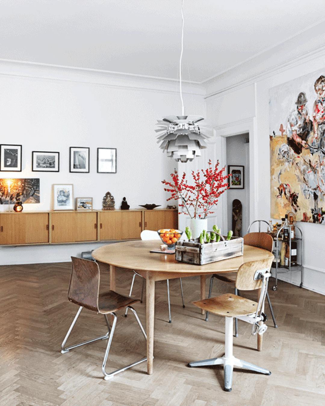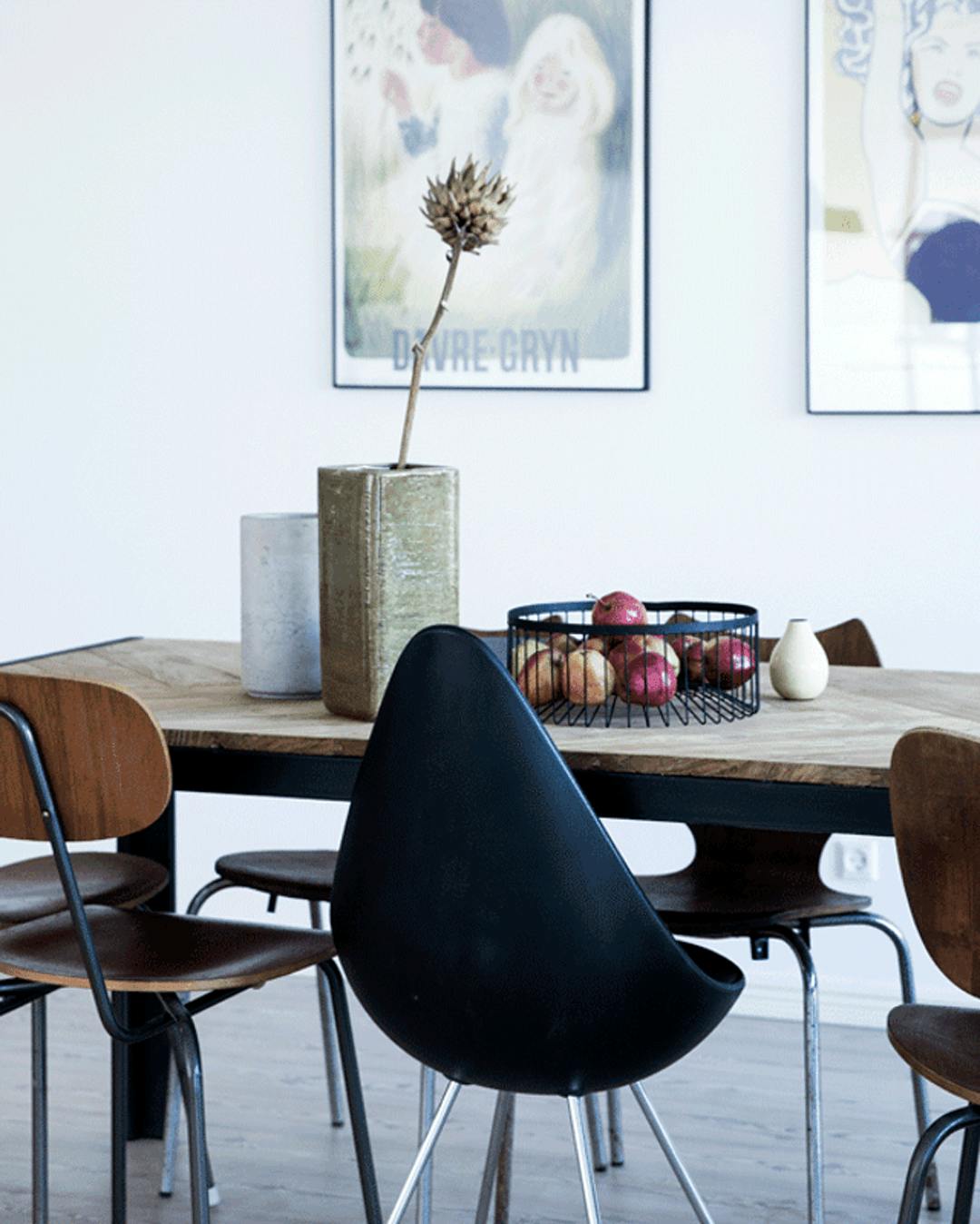 En hyggeligt hjem, hvor billeder på væggen og miksede spisebordsstole er med til at give stuen karakter.