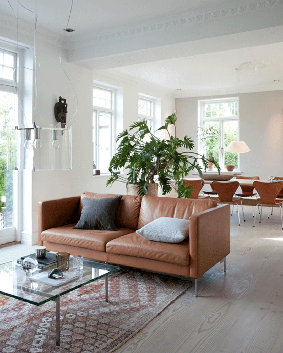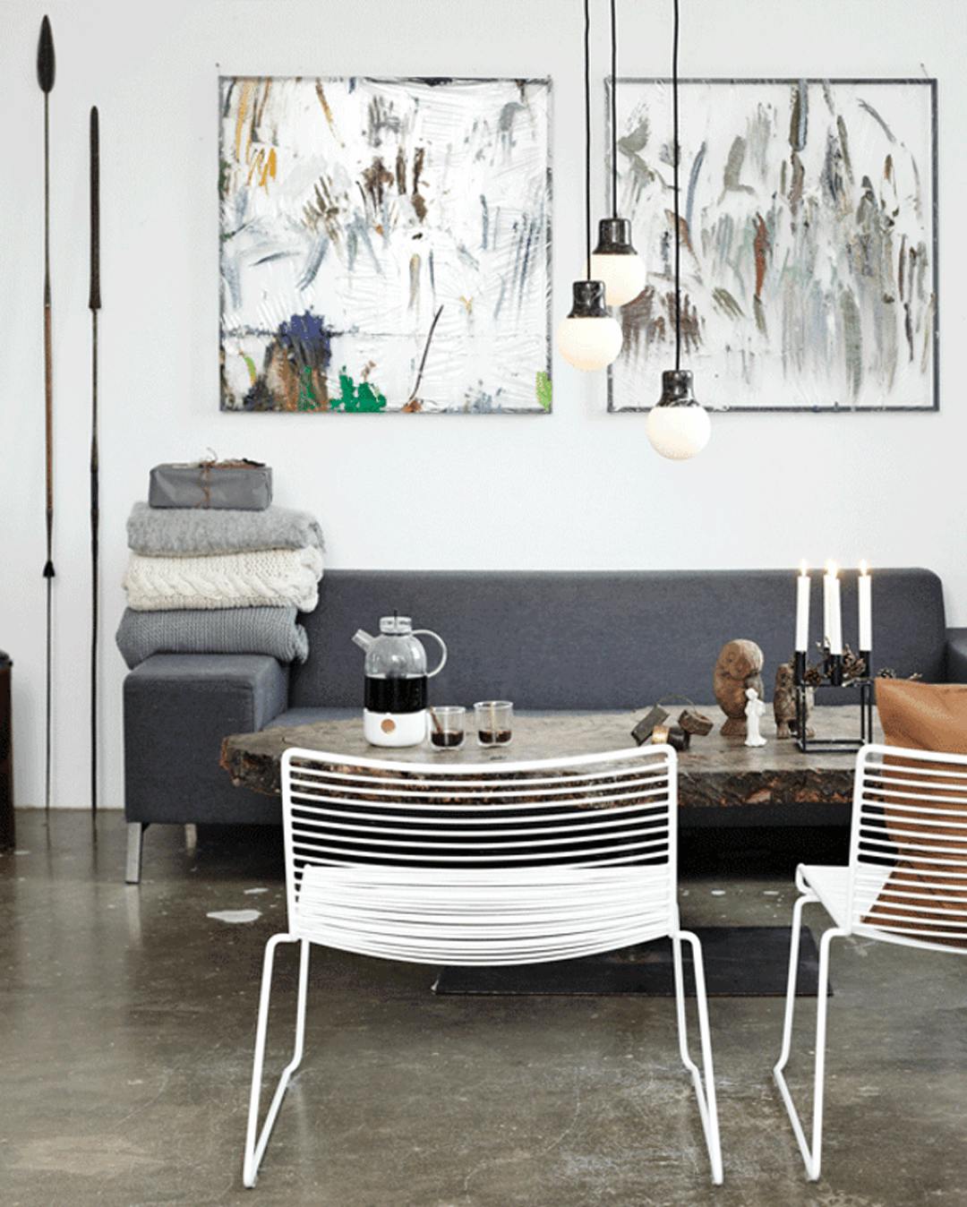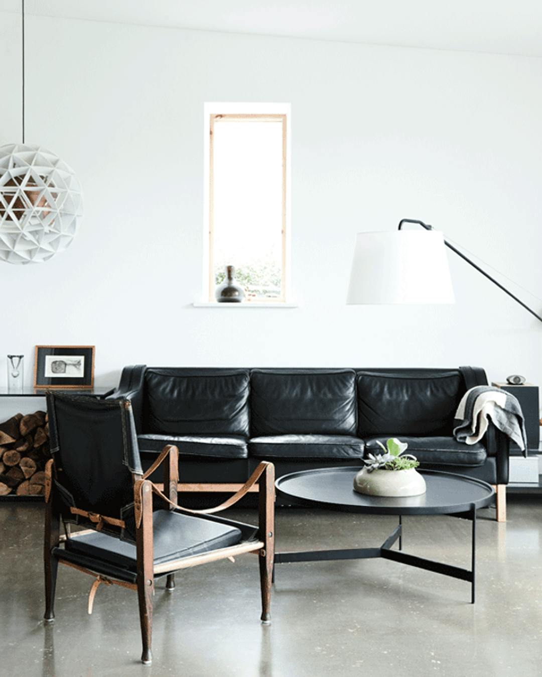 Et mere råt, nordisk udtryk med betongulv, lædersofa og sort safaristol.