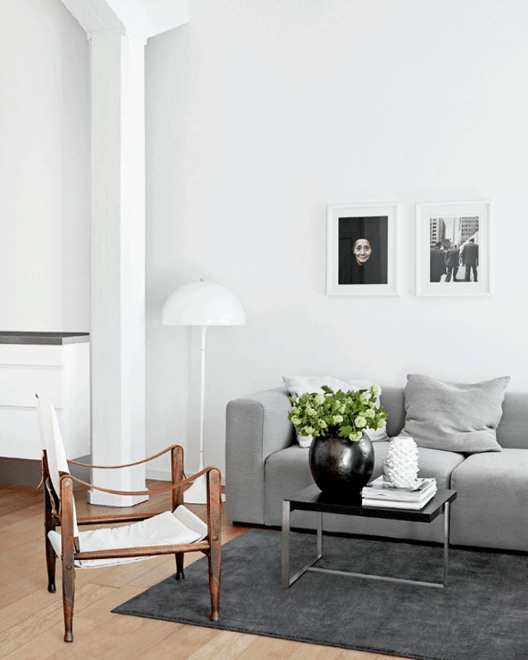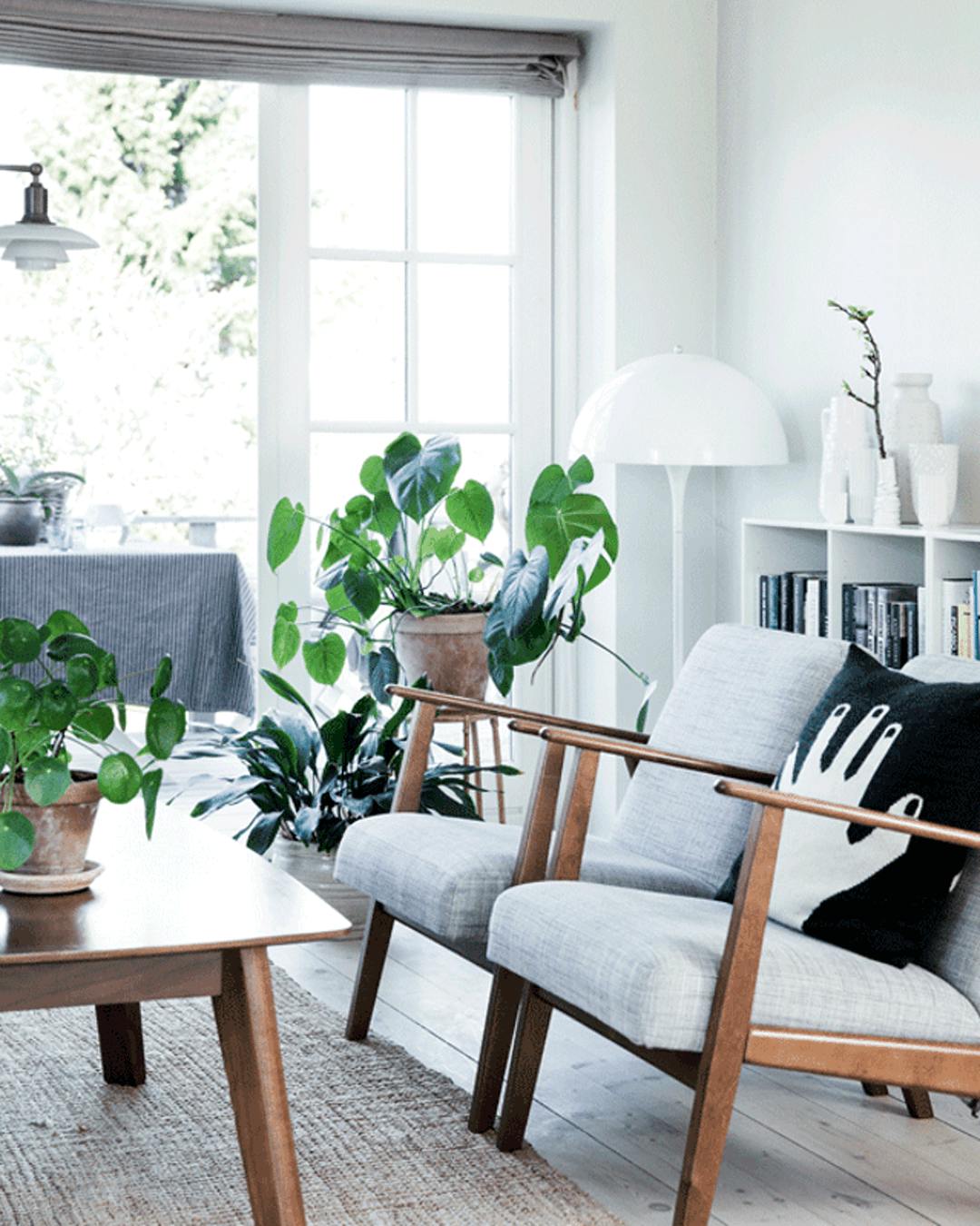 De hvide rammer er gjort mere hyggelige med et sofabord og et par lænestole i mørkt træ samt en masse grønne planter. De grå lænestole er fra IKEA.