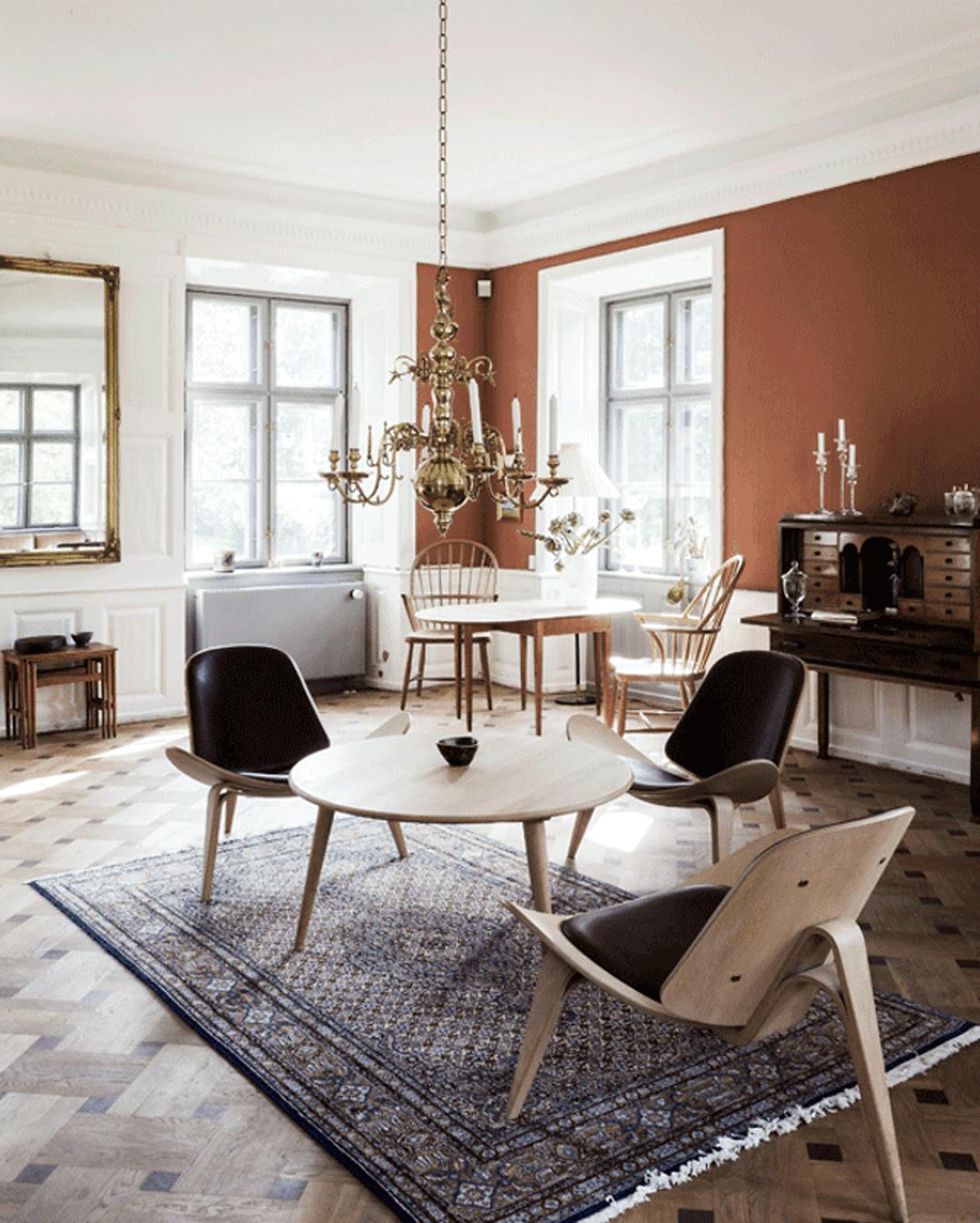 Selvom den ene væg er malet terracotta-farvet, betyder det ikke, at stuen bliver alt for farvestrålende. Farven giver varme i rummet, der er omgivet af danske designklassikere.