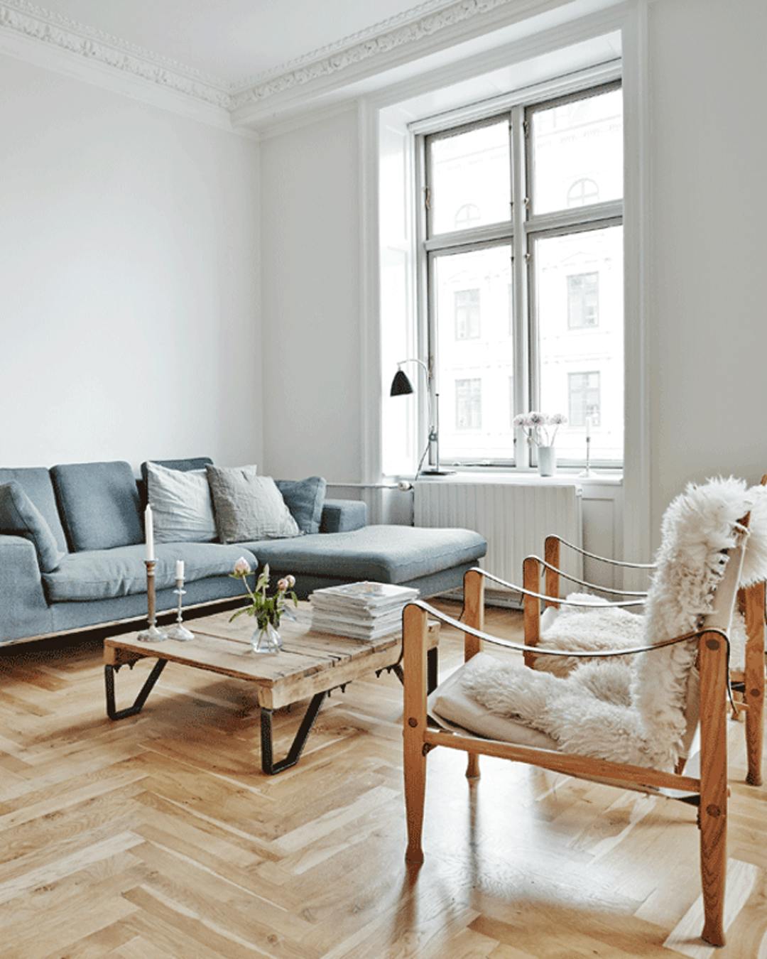 Det lyse gulv i stuen gør, at møblerne bliver fremhævet på fineste vis. Det bidrager også til et rent udtryk i hjemmet.