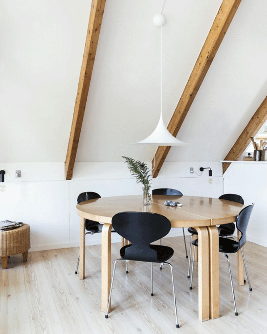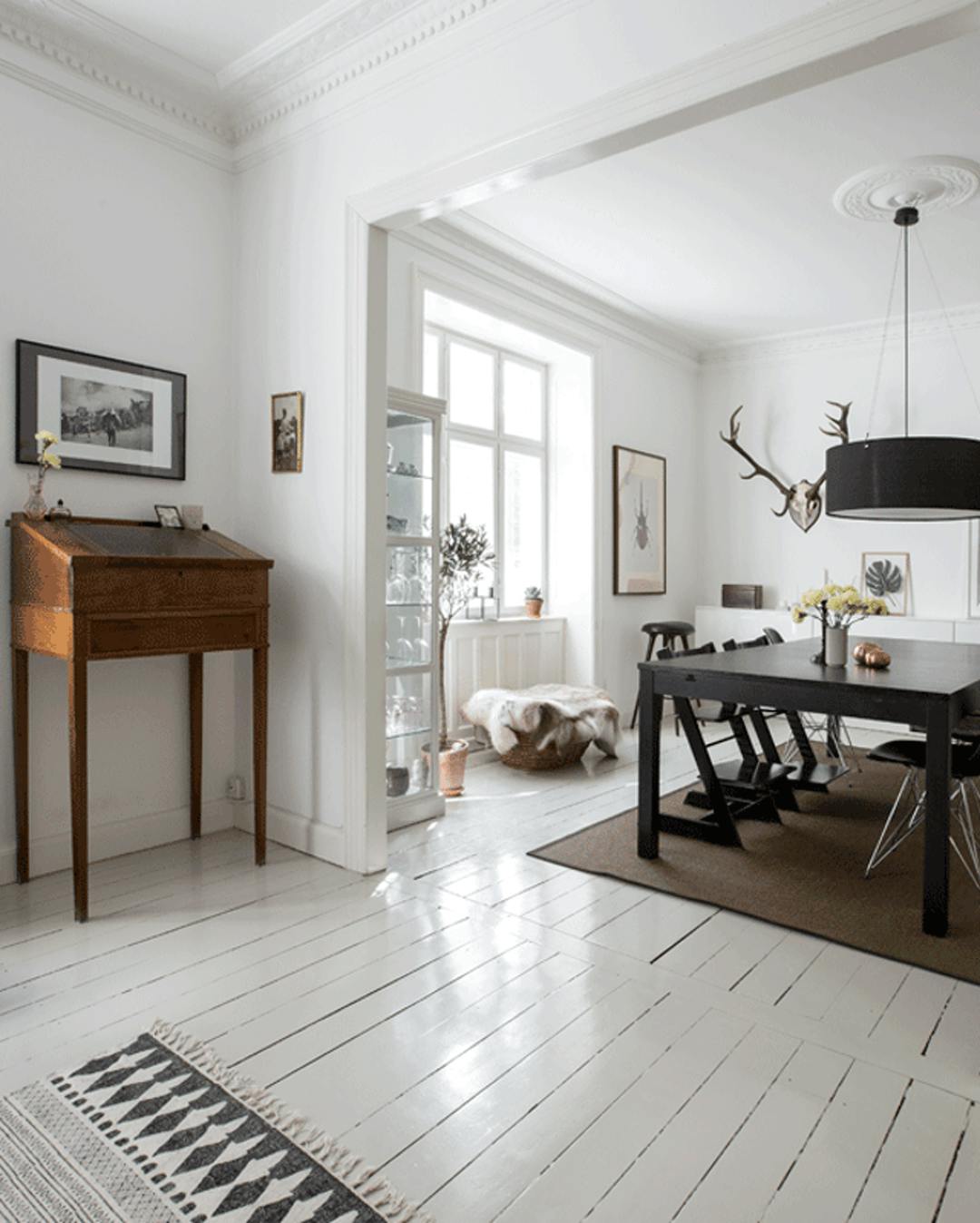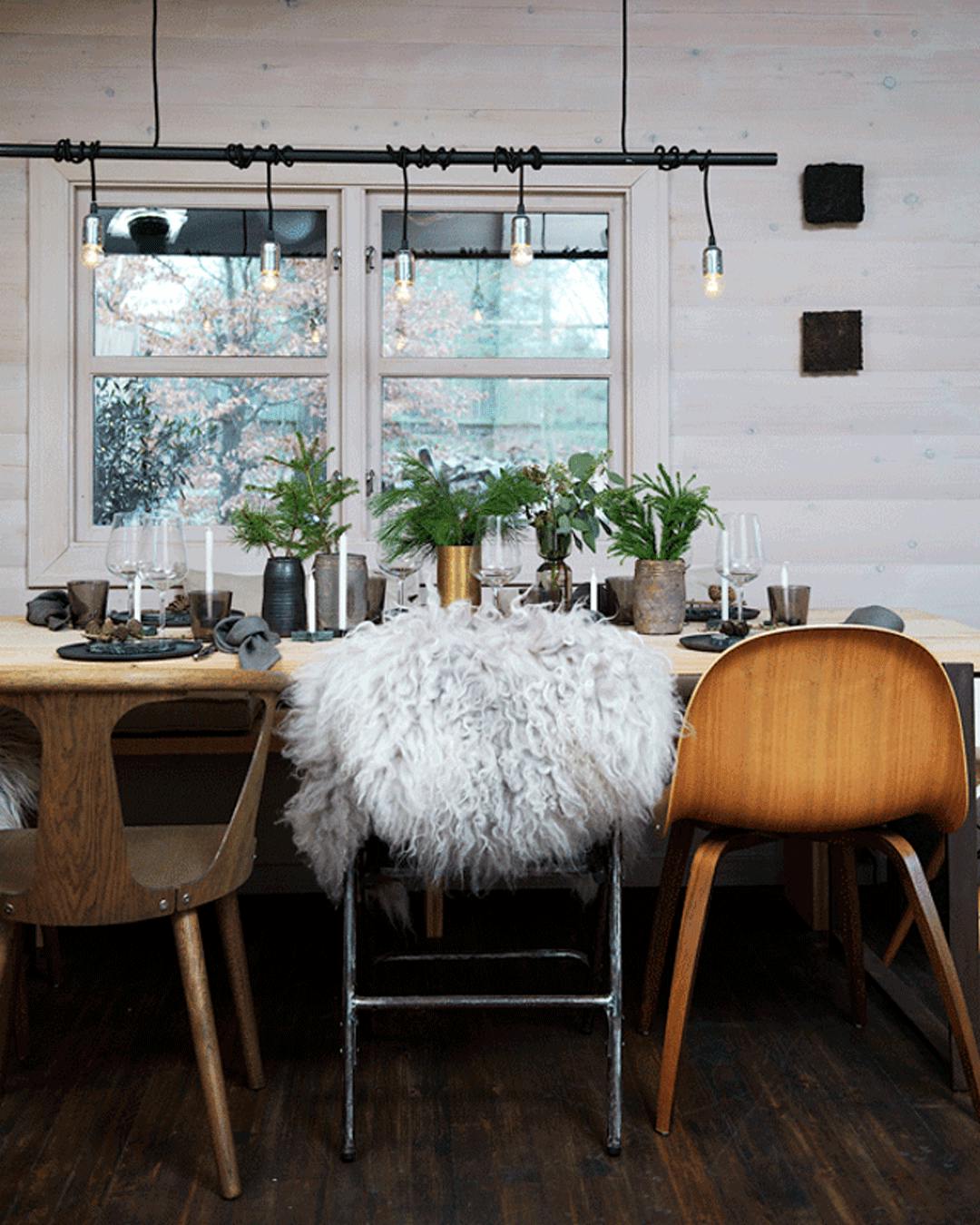 Nordisk hygge når det er allerbedst. Den industrielle lampe, spisebordsstolene i mørkt træ og det bløde skind giver rummet et råt udryk.