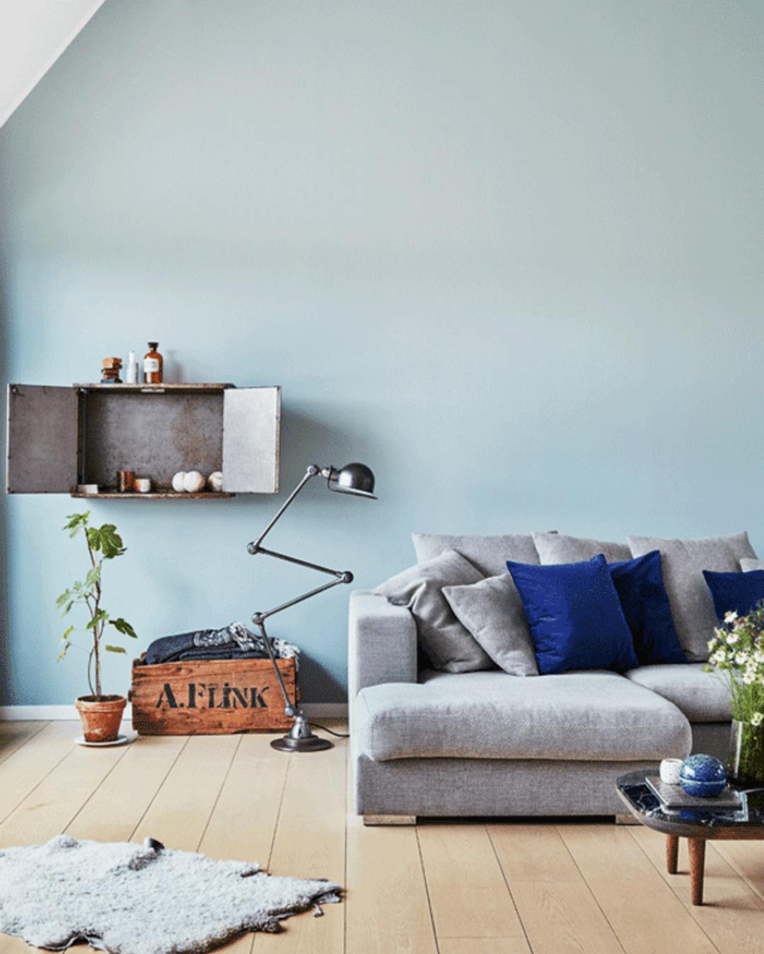 Selvom man ikke finder mange farver i den nordiske indretning, passer den her kølige blå væg overraskende godt ind. Her er marmor, skind og træmaterialer kombineret på fineste vis.