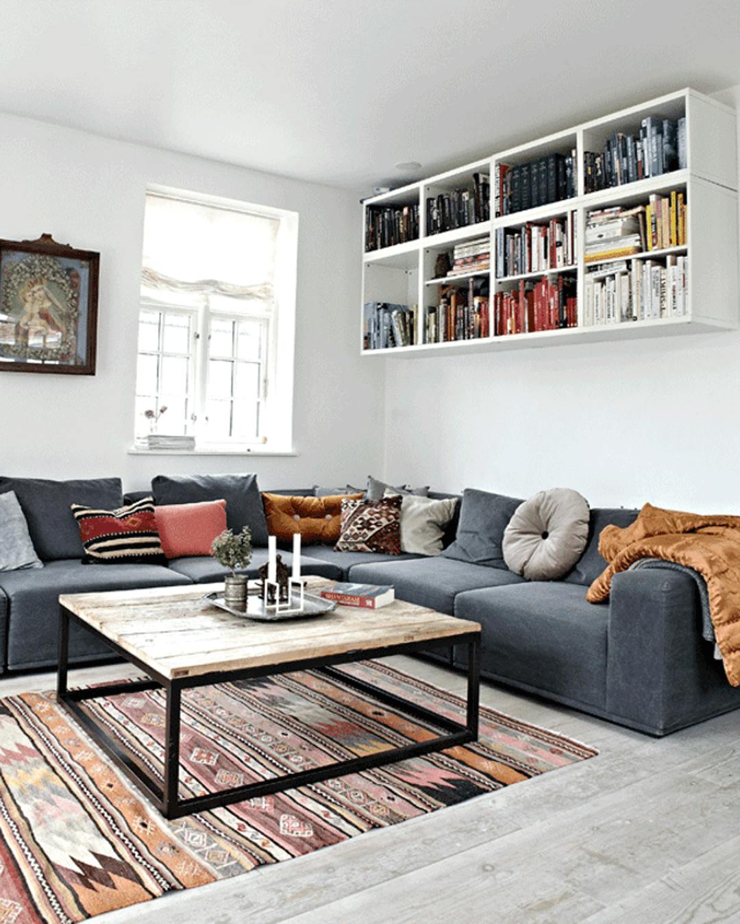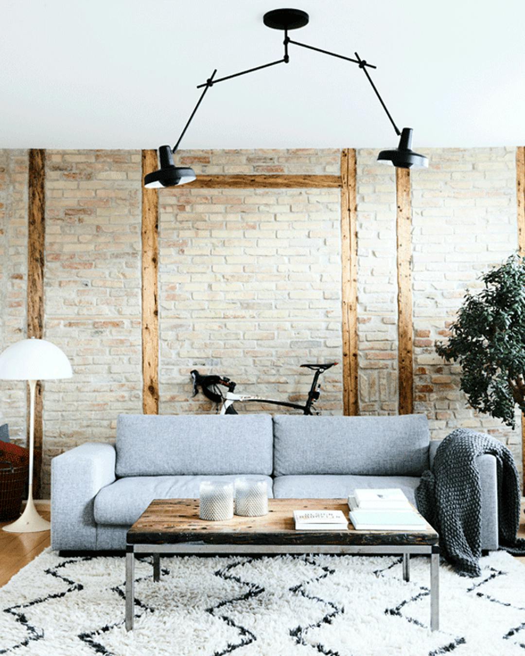 Den grå sofa er hit i den skandinaviske indretning. Sofaen er her omgivet af rå naturmaterialer som sofabordet og murstensvæggen.