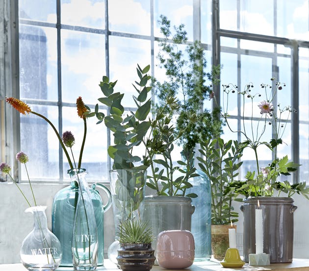 Forår og grønne planter og blomster hører sammen. Skab et massivt grønt udtryk i dit hjem ved at samle alle dine stueplanter i en klynge i vindueskarmen eller på et bord, og supplér med buketter og grene i vaser og måske en enkelt afskåren blomst i en flaske. Tænk på, at der både skal være høje og lave planter og blomster i din opstilling, på den måde kommer alt det grønne til at virke som en massiv forårsvæg, der er lige til at blive i godt humør af.