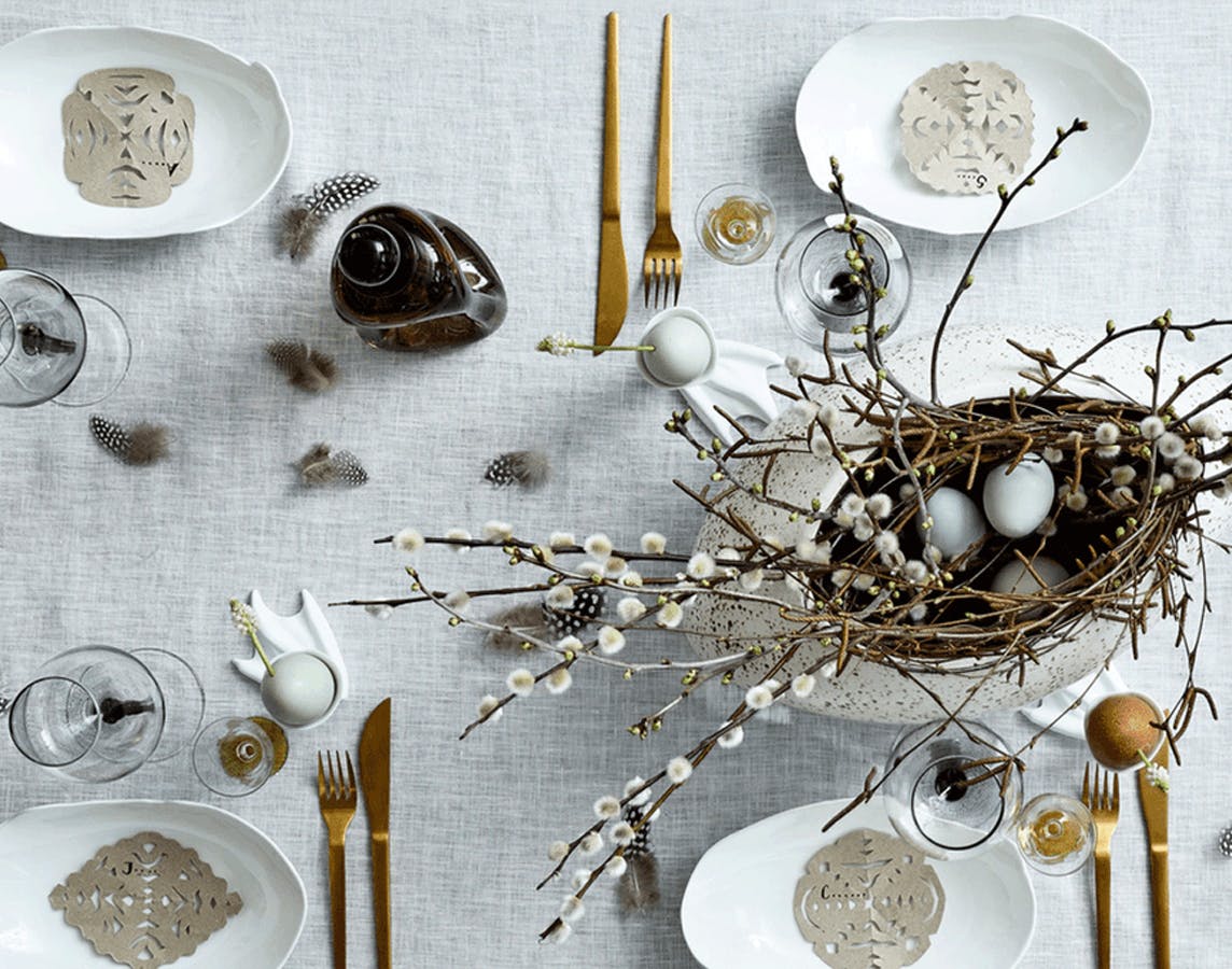 Selvom påske-borddækningen ofte forbindes med pastelfarver, kyllinger og æg, kan man sagtens holde sit påskebord rustikt og enkelt. De fleste af os har hvide eller lyse tallerkner, og dem kan du sagtens bruge til at dække et smukt påskebord. Giv det hvide service lidt modspil med bestik, der skinner, og en dug i en afdæmpet farve, der matcher de gyldne toner.