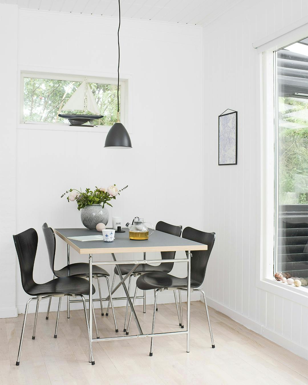 Hvide møbler har flere fordele. De er tidløse, men de tager også mindre fokus og virker lettere i en lille spisestue. Spræl i stedet med farver på resten af interiøret og på væggen.