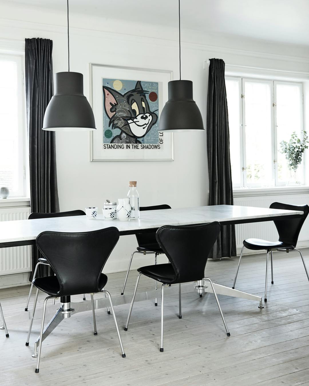 Et stort rum er perfekt til at give møbler og kunst velfortjent opmærksomhed. Her fanger farverne, der går igen på 7-er stolene og den opsigtsvækkende kunst, øjet i første omgang.