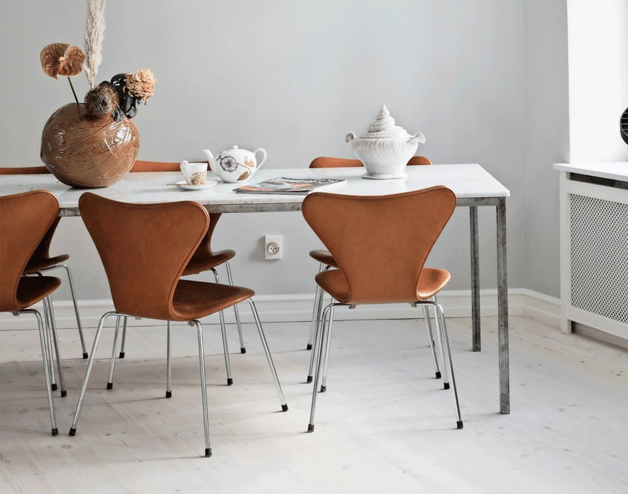 Endnu en smuk og mere enkel lysekrone fra Murano i glas lavet i 1950’erne. Murano er italiensk vintage og gør noget godt i ethvert rum. I denne spisestue er farverne meget nedtonede undtagen stole og vase — det er også en måde at bruge lysekronen på, hvis du ikke ønsker, den skal larme alt for meget.