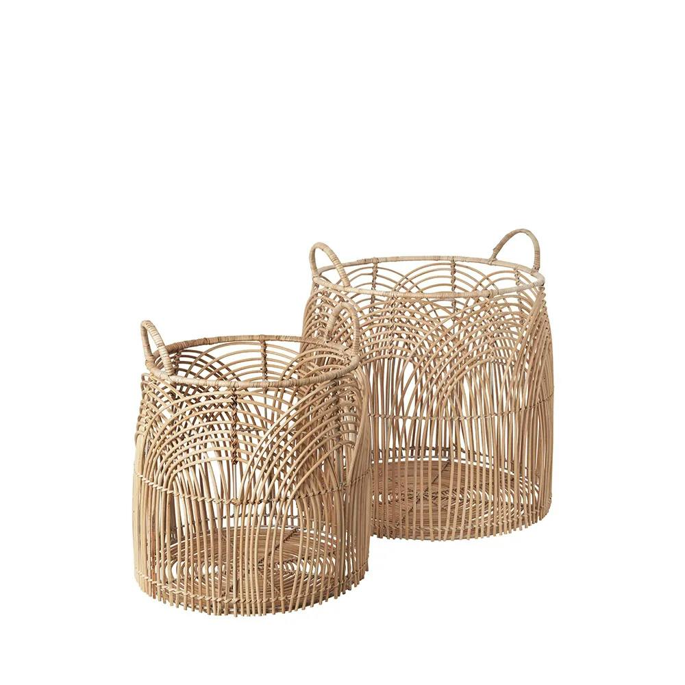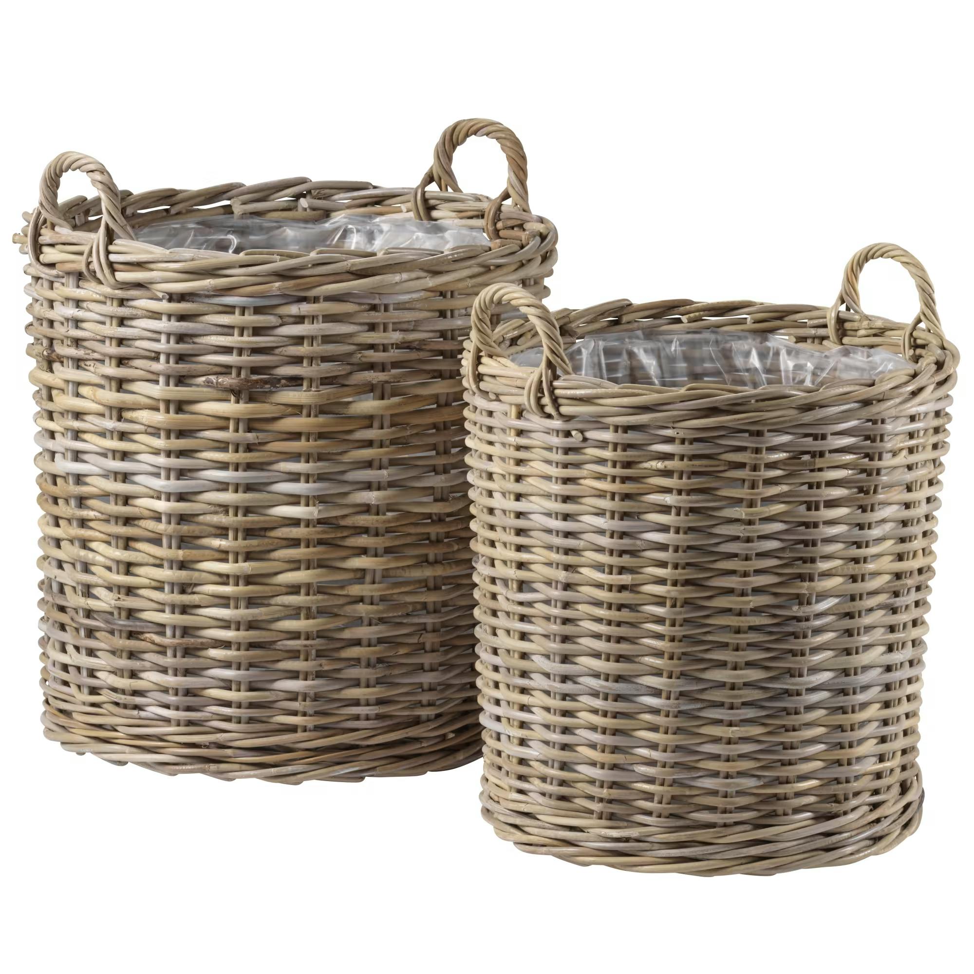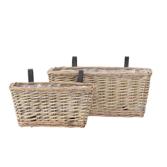 Kurvene her er i kraftigt rattan, så de kan holde til vind og vejr. De er foret med plastik, så du kan have planter i dem. Og sidst, men ikke mindst, så er kurvenes bunde hævet, så der ikke samler sig fugt, og vandet kan løbe fra, når kurvene står udendørs.
