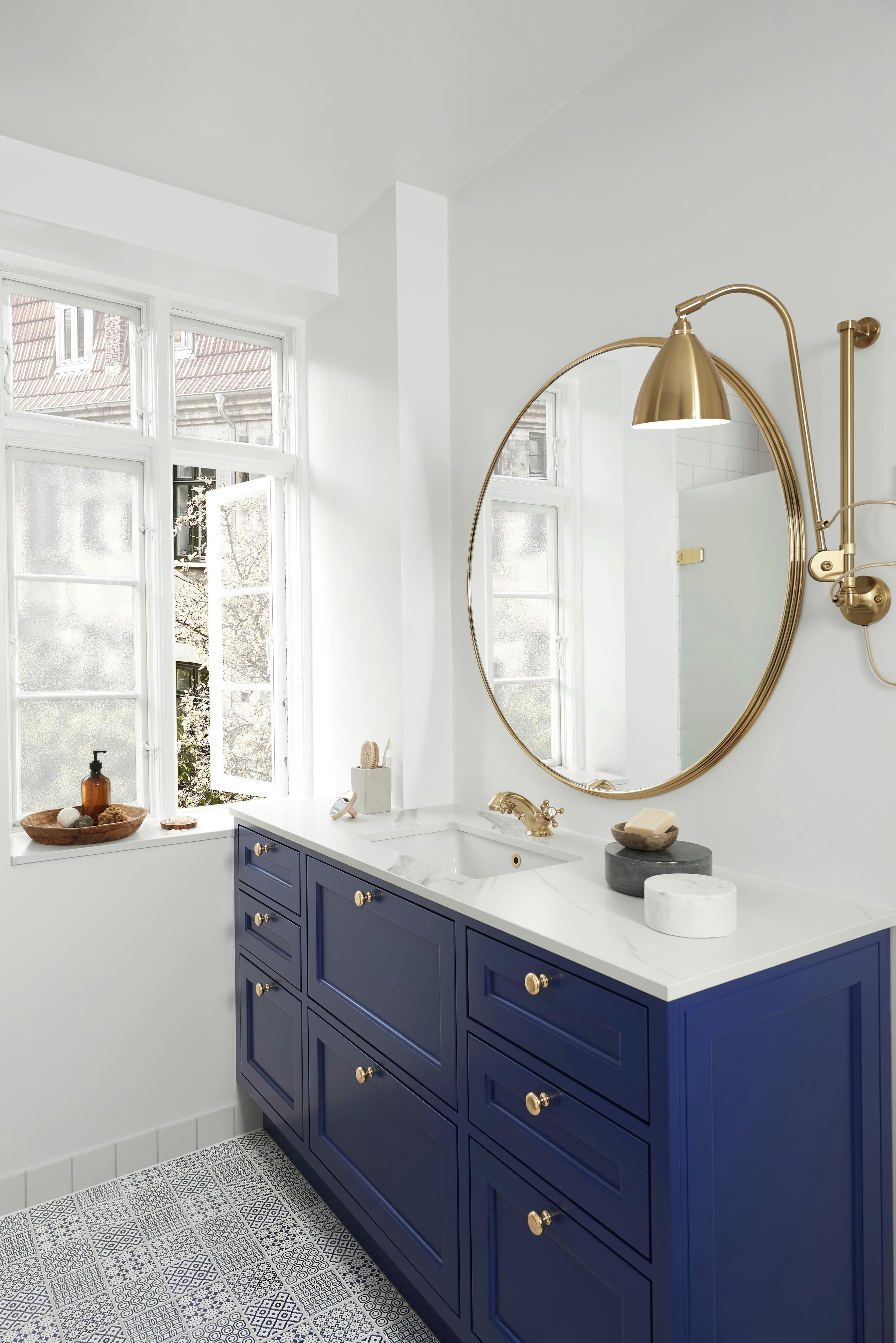 Har du mod på lidt farver, kan du gå efter en tidløs nuance, som ikke går af mode med det samme. Her har det blå badeværelsesmøbel fået selskab af greb i messing. Bademøbel fra Hanstholm Køkkener, spejl og lampe fra Gubi.