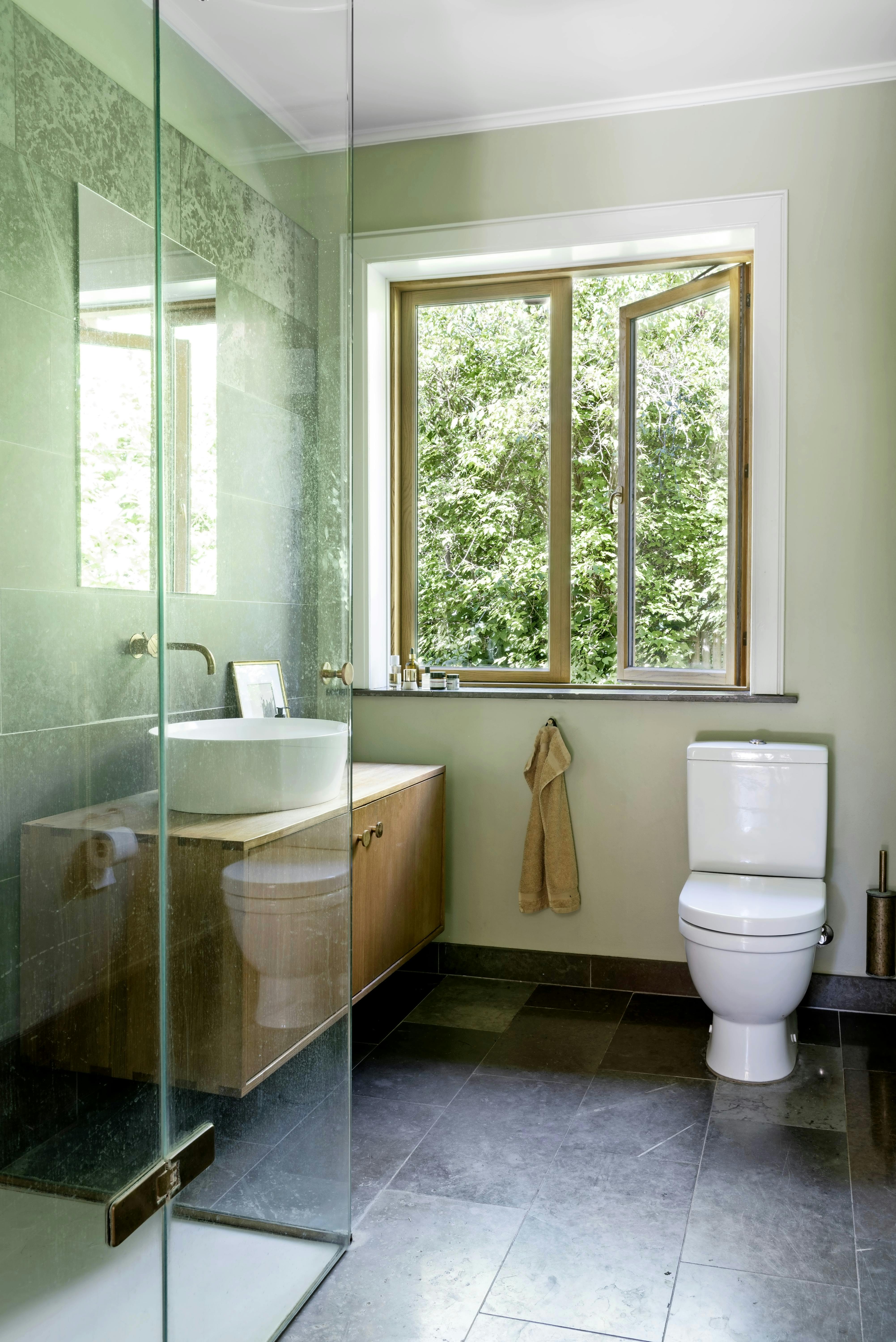Hvis du kan undvære opbevaringspladsen, bidrager et badeværelsesmøbel med en åben hylde til en hyggelig og landlig stil. Selvom rørene under vasken er fristående, er udtrykket enkelt, fordi rør og armatur er pænt og simpelt. Badeværelsesskabet her er fra Kvänum. Mangler du ekstra opbevaring, kan du altid supplere med et toiletskab til diverse ting.