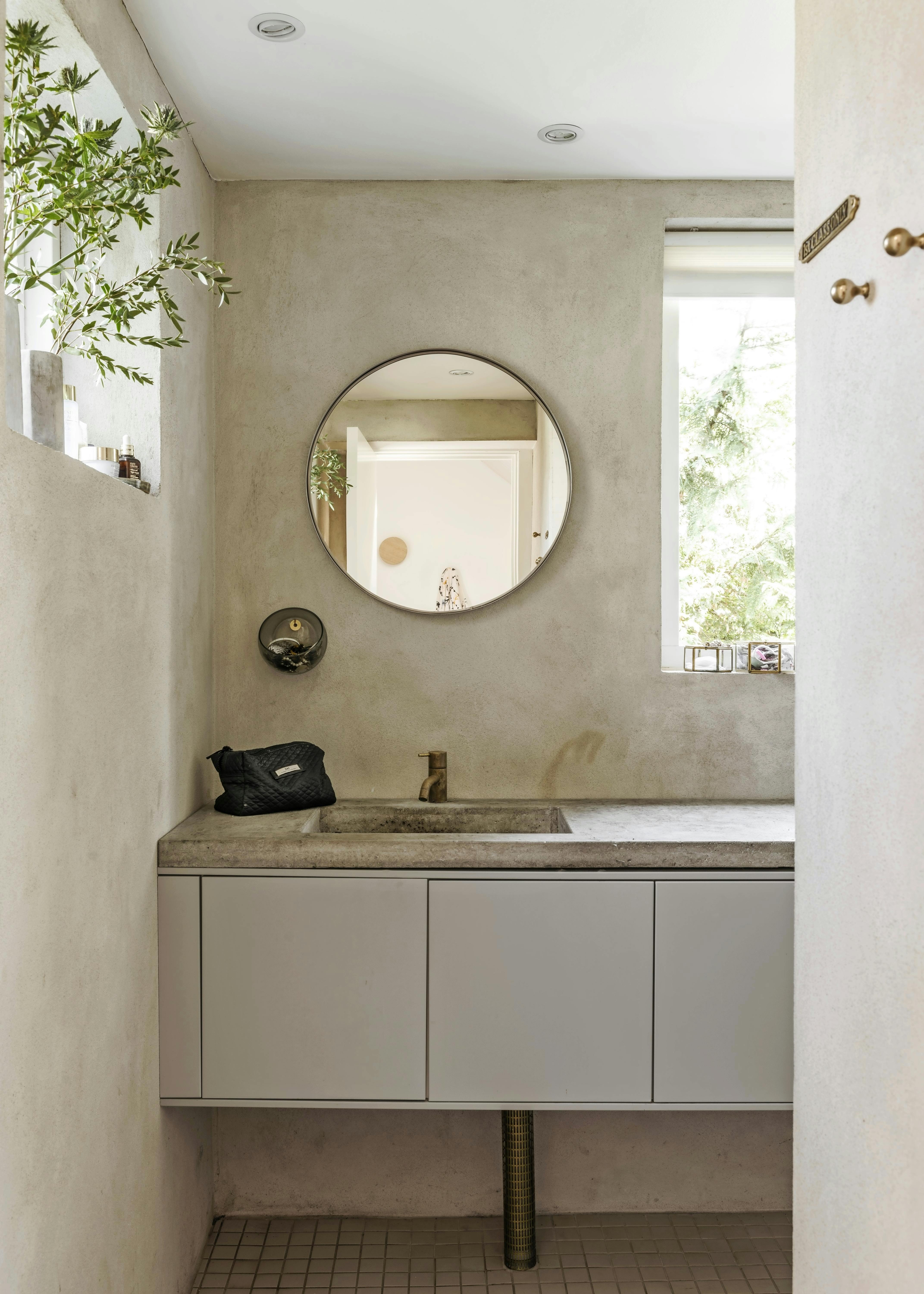 Hvis du kan lide et enkelt udtryk, kan du gå efter tone i tone ved at vælge et badeværelsesmøbel i samme nuance som væggene. Her ligger kontrasterne i materialevalgene. Badeværelsesskabet her giver rummet et roligt udtryk.