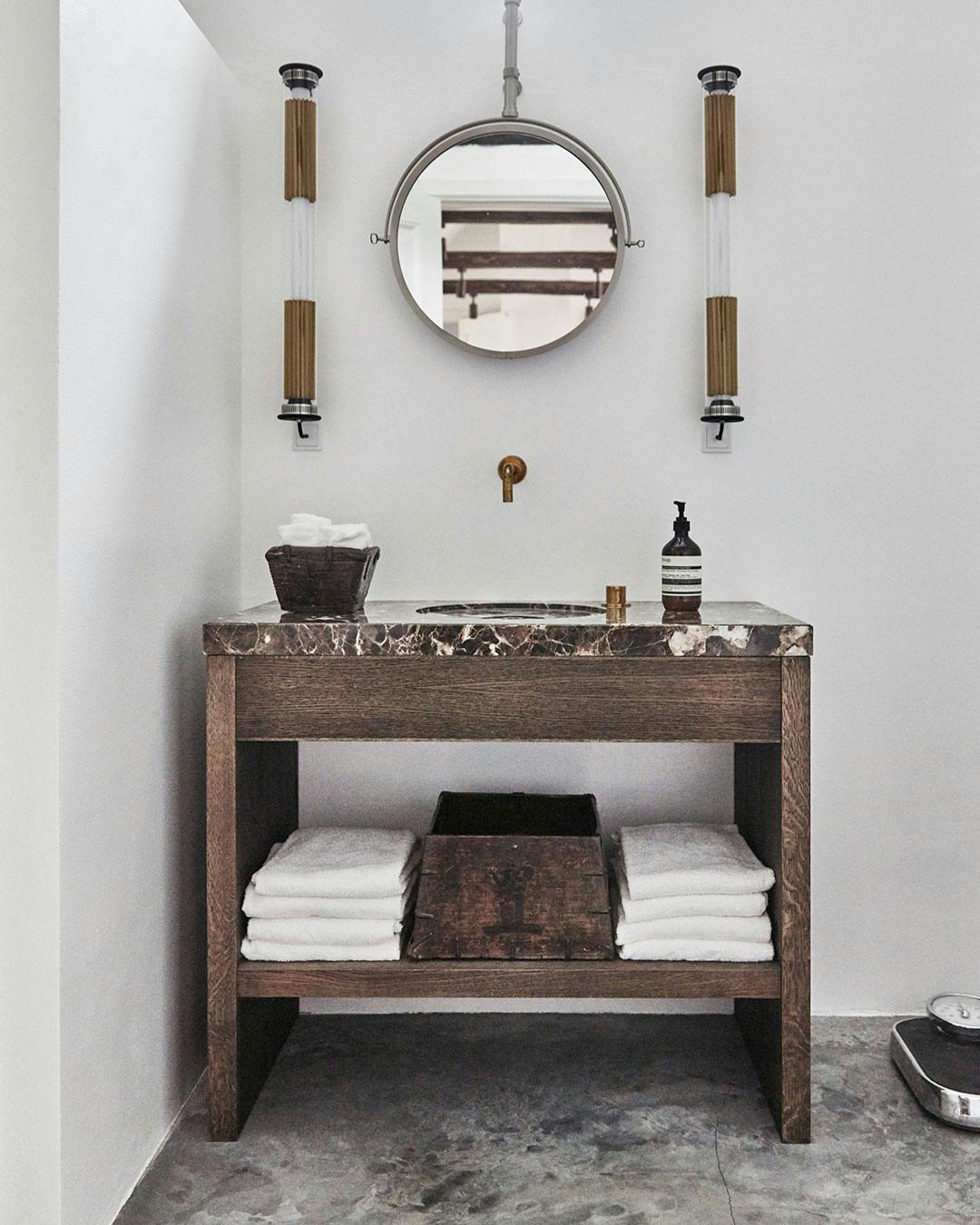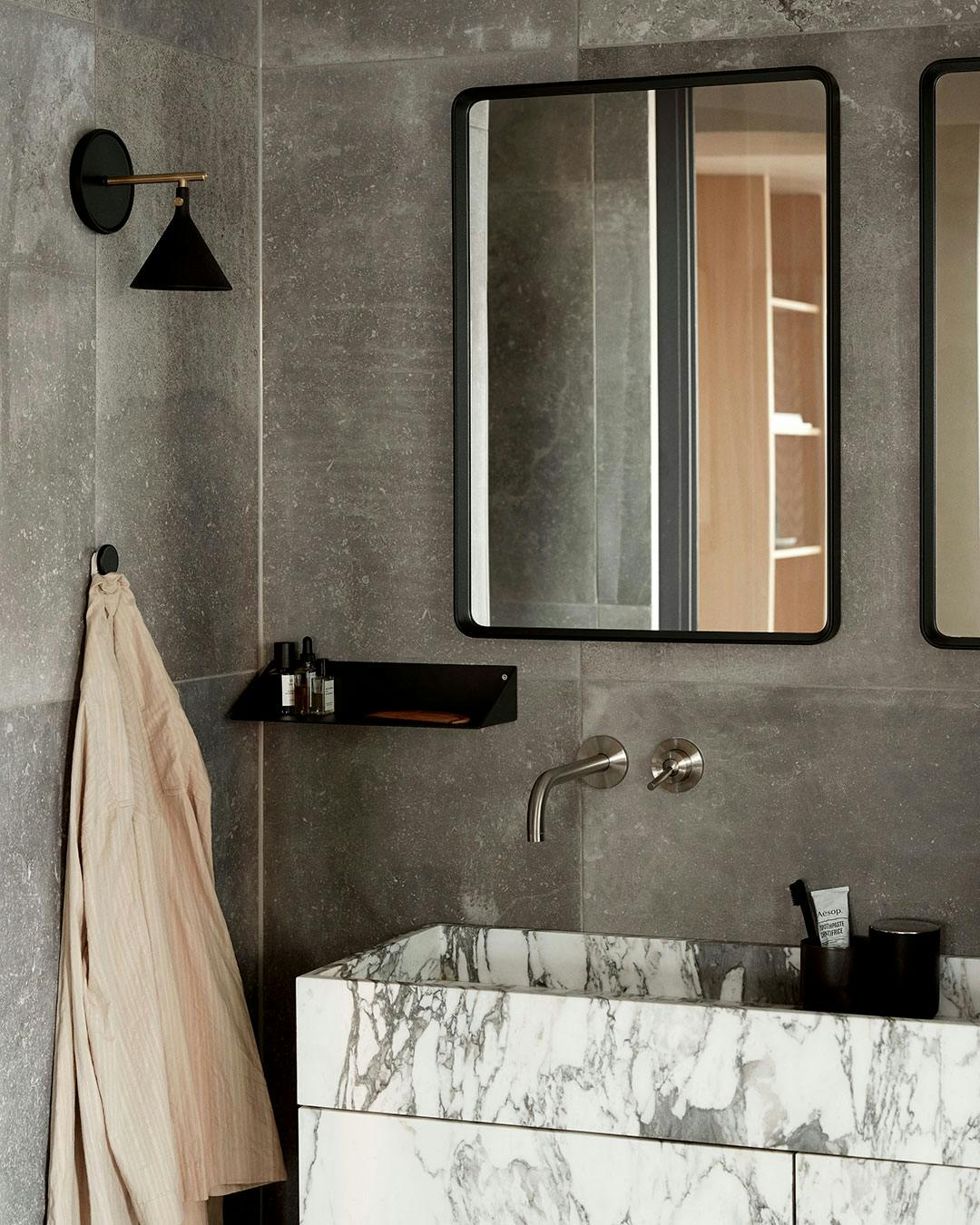 Skab wauw-effekt ved at vælge et opsigtsvækkende materiale til dit badeværelseesmøbel. Supplér med lækre håndklæder og andre tekstiler for at bløde det lidt kolde og hårde udtryk op. Marmorvask designet af Norm Architects til hotellet The Audo, lampe, lampe og hylde fra Menu.