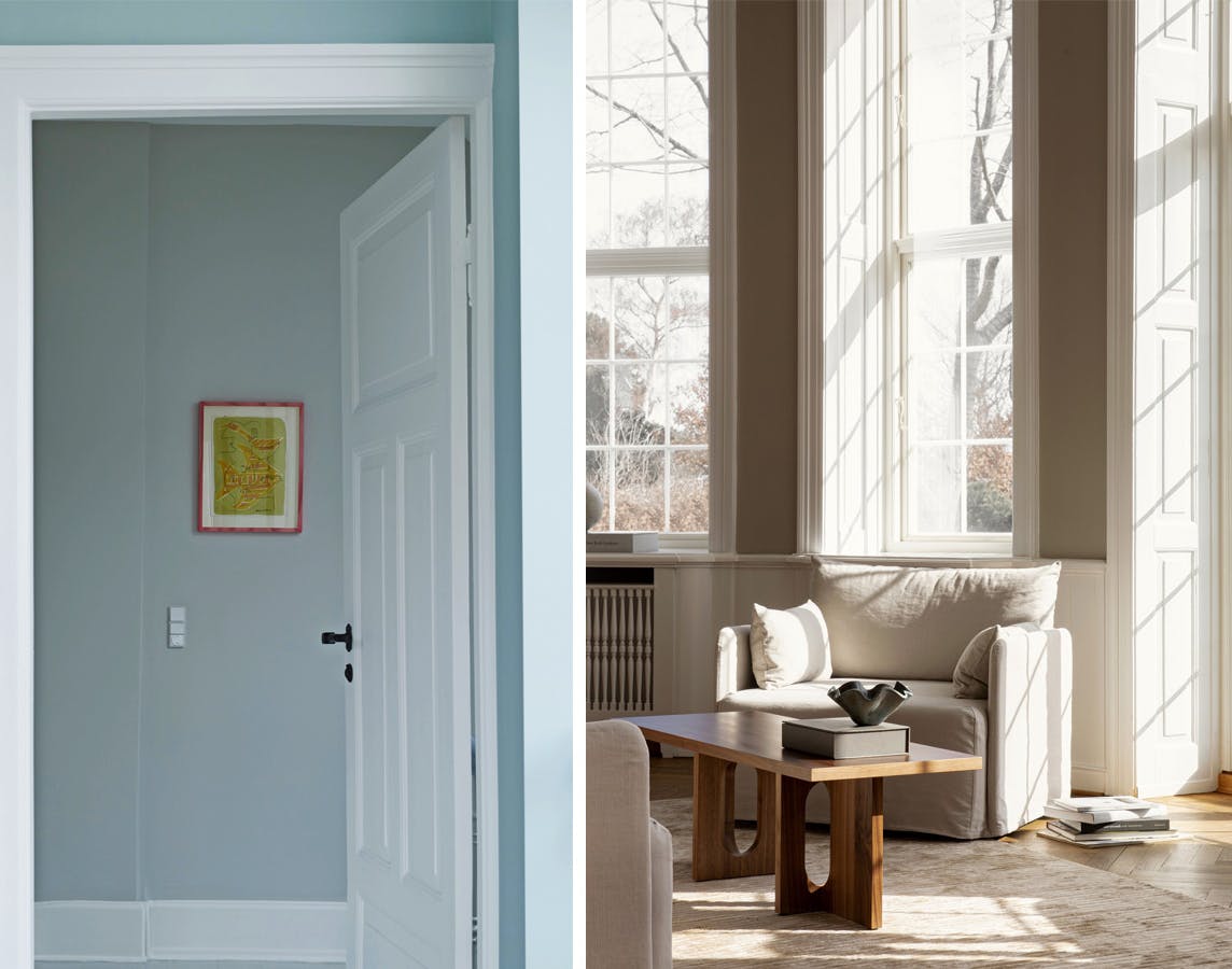 I dag findes der maling, der har en helt mat finish, og som stadig kan tåle det hårdere slid, som døre og lister udsættes for, så det kan godt lade sig gøre at male alt mat. Men det er vigtigt at huske, at forskellige glans og farver på vægge kontra lister og døre ikke kun er et praktisk spørgsmål, det har også en æstetisk funktion. Lidt ligesom punktummer og kommaer i poesi. Hvis du ikke vil bryde med en anden farve, kan mødet mellem mat og blank, selvom grundfarven er ens, bare være den subtile markør, du skal bruge, for at markere start og slut af dine vægge og træværk. Husk på, at forskellige glans giver forskellige dybder og oplevelser af samme farve. F.eks. opleves en mørk farve (f.eks. grå) mørkere med en blank overflade end med en mat finish.