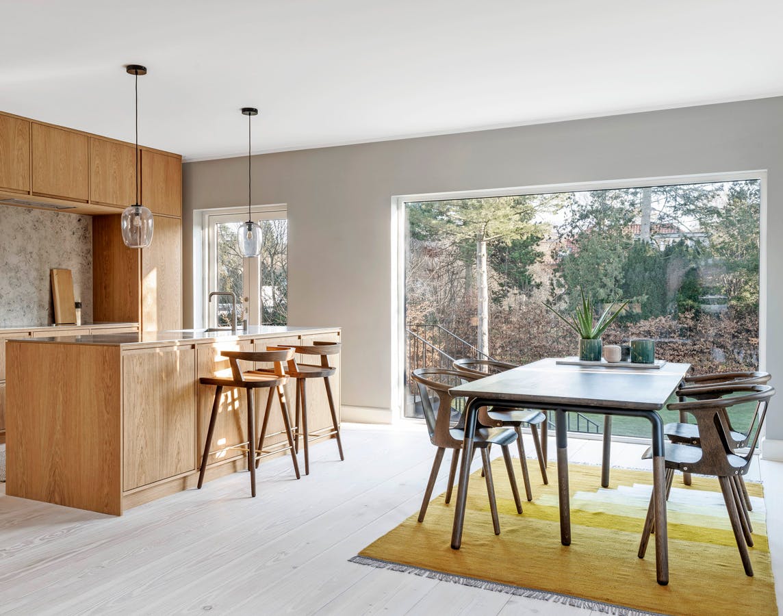 Du kan dele det op både visuelt og fysisk. Et simpelt trick til at gøre køkkenet til én enhed og spisepladsen til en anden er at arbejde med sammensætningen af farver. Mal en baggrundsvæg ved spisepladsen, dekorér med et stort tæppe under bordet, der matcher vægfarven, og hæng en større lampe over spisepladsen for at gøre det til sin egen zone. Hvis du også eller i stedet ønsker at skærme med fysiske genstande, kan du bruge et højere afsætningsbord mellem køkken-alrum og spiseplads, som fungerer på samme måde som en køkkenø. Et arbejdsområde og afgrænsning i ét. Du kan også bruge et større gulvanlæg, en rumadskillende bogreol og lignende møbler, der slører udsynet ind til selve køkkenet.