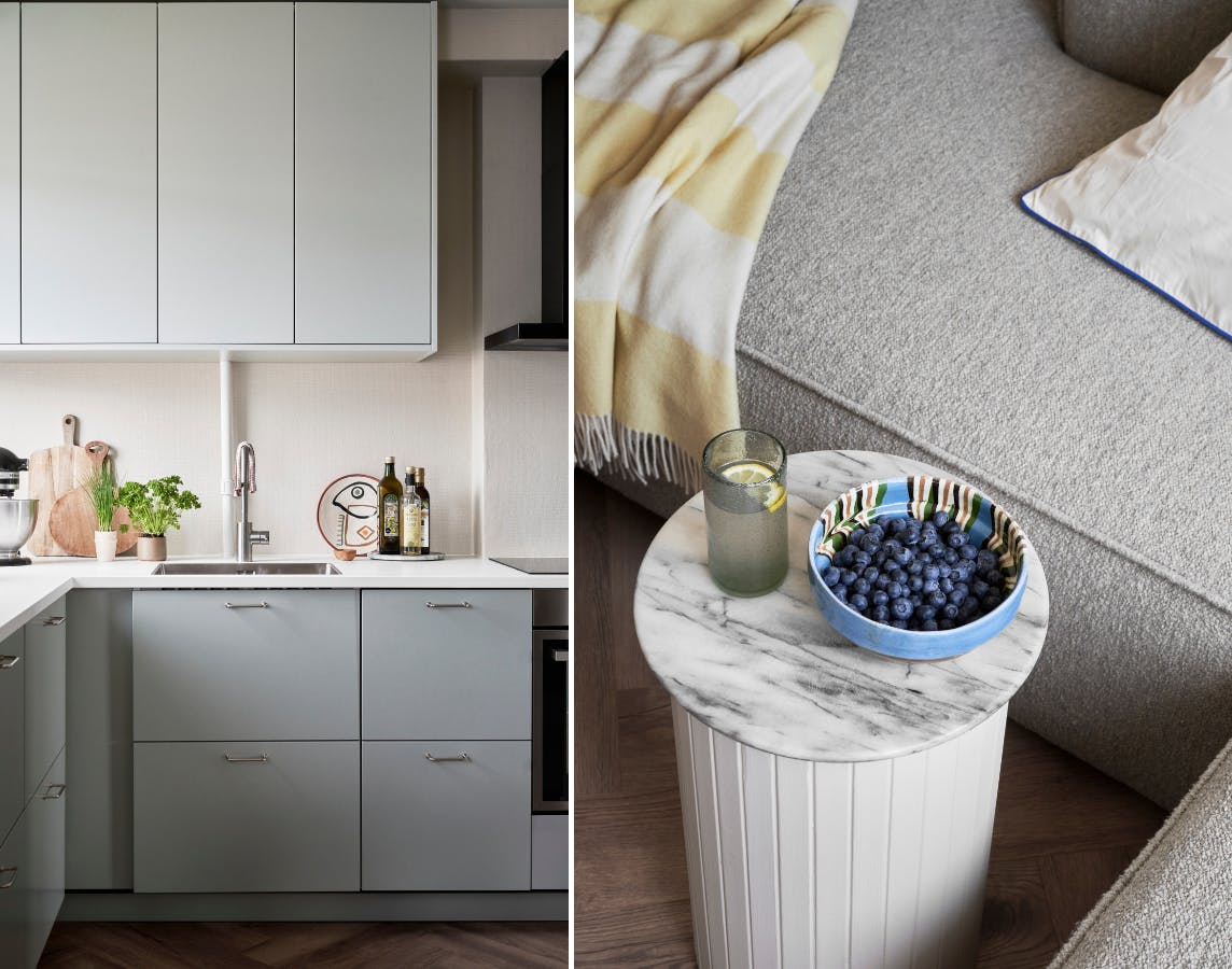 Køkkenet er fra Ikea med fronter fra Hackk. Greb fra Villahus og keramikfad fra Lrnce.