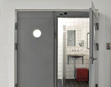 Med lukkede døre ligner badeværelset en ganske almindelig varerelevator. Overraskelsen kommer, når man åbner. Råt og rustfrit look blev løsningen på et nyt bad i en gammel vareelevator.