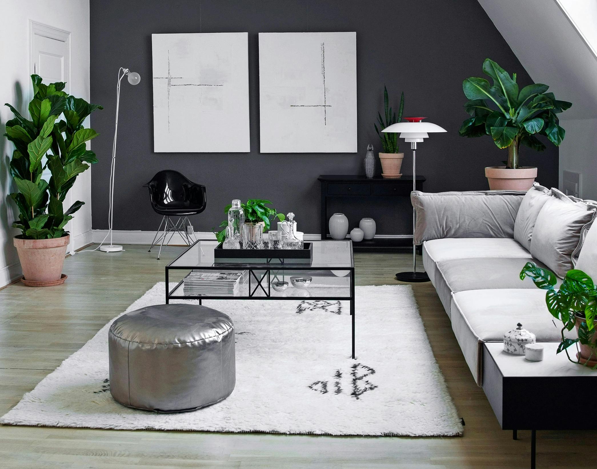 Det var vigtigt at få masser af grønne planter ind, da lejligheden nærmest har drivhusstemning med det store vinduesparti, og de giver liv til en indretning. Sofaen er fra Handvärk, marmorkrukkerne er fra Louise Roe, og planterne er fra Greenify.