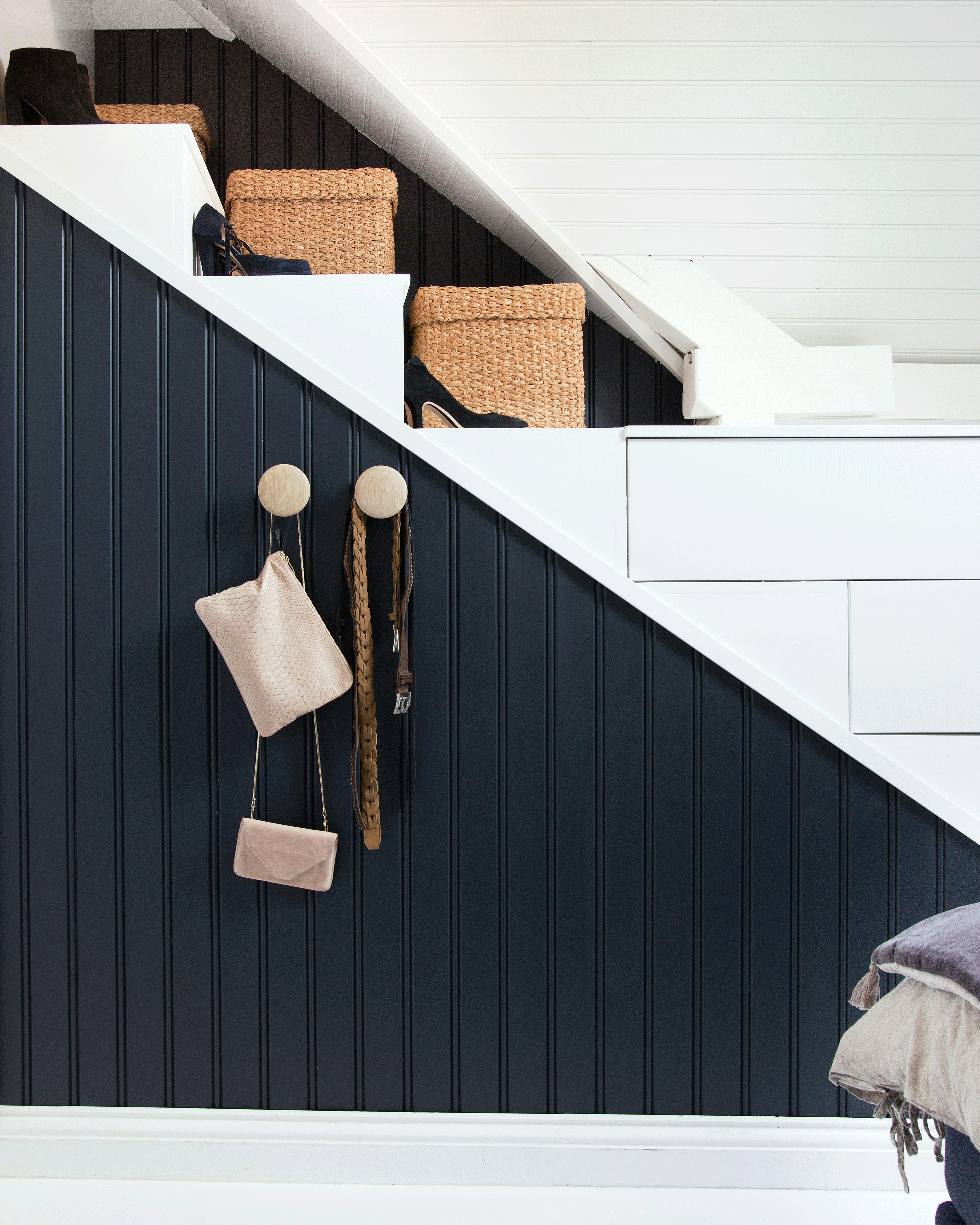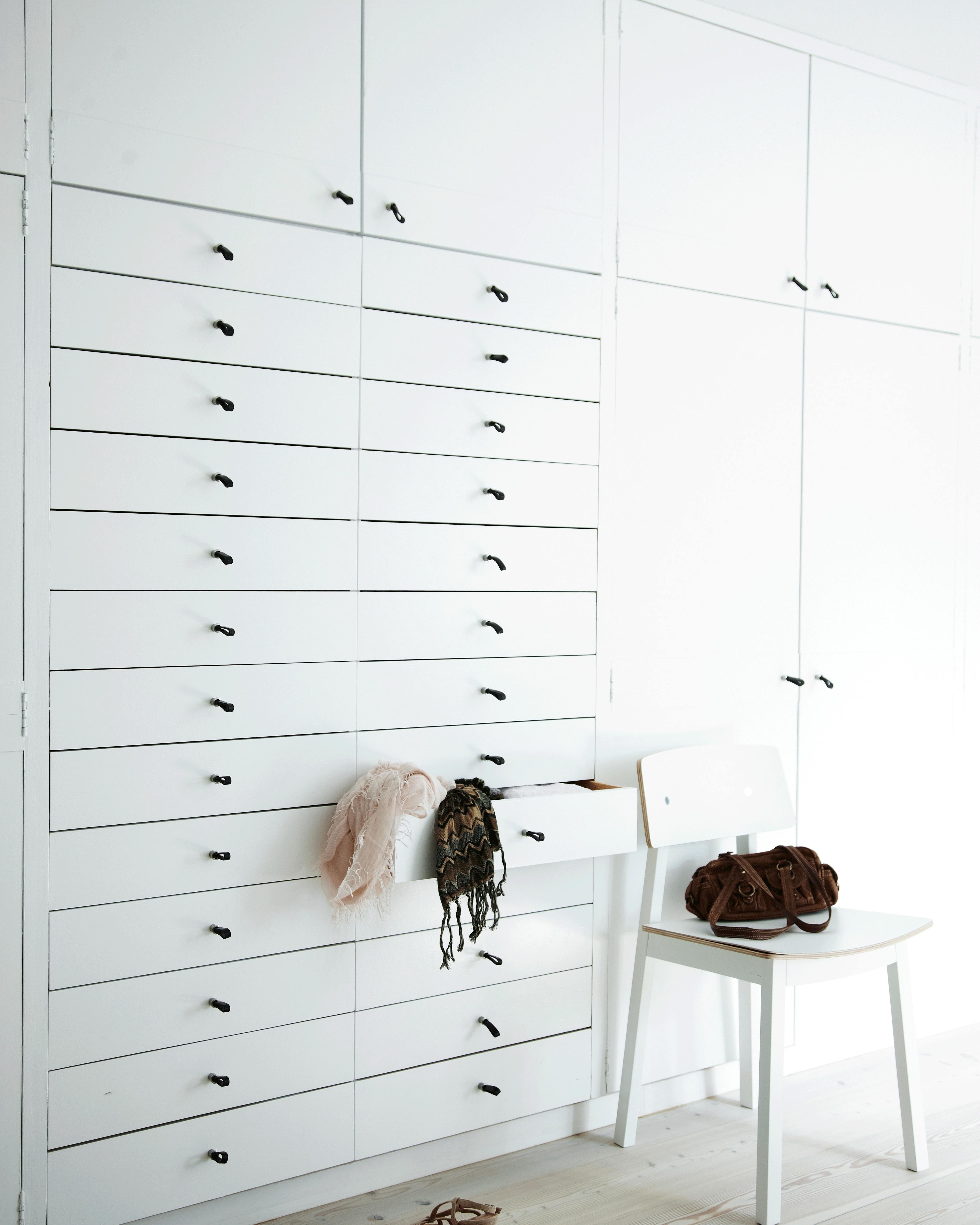 Bor du småt, kan et indbygget skab med låger og skuffer, der når helt op til loftet, være en genial løsning. Mal det hele hvidt og vælg sjove greb, hvis du vil have et anderledes look