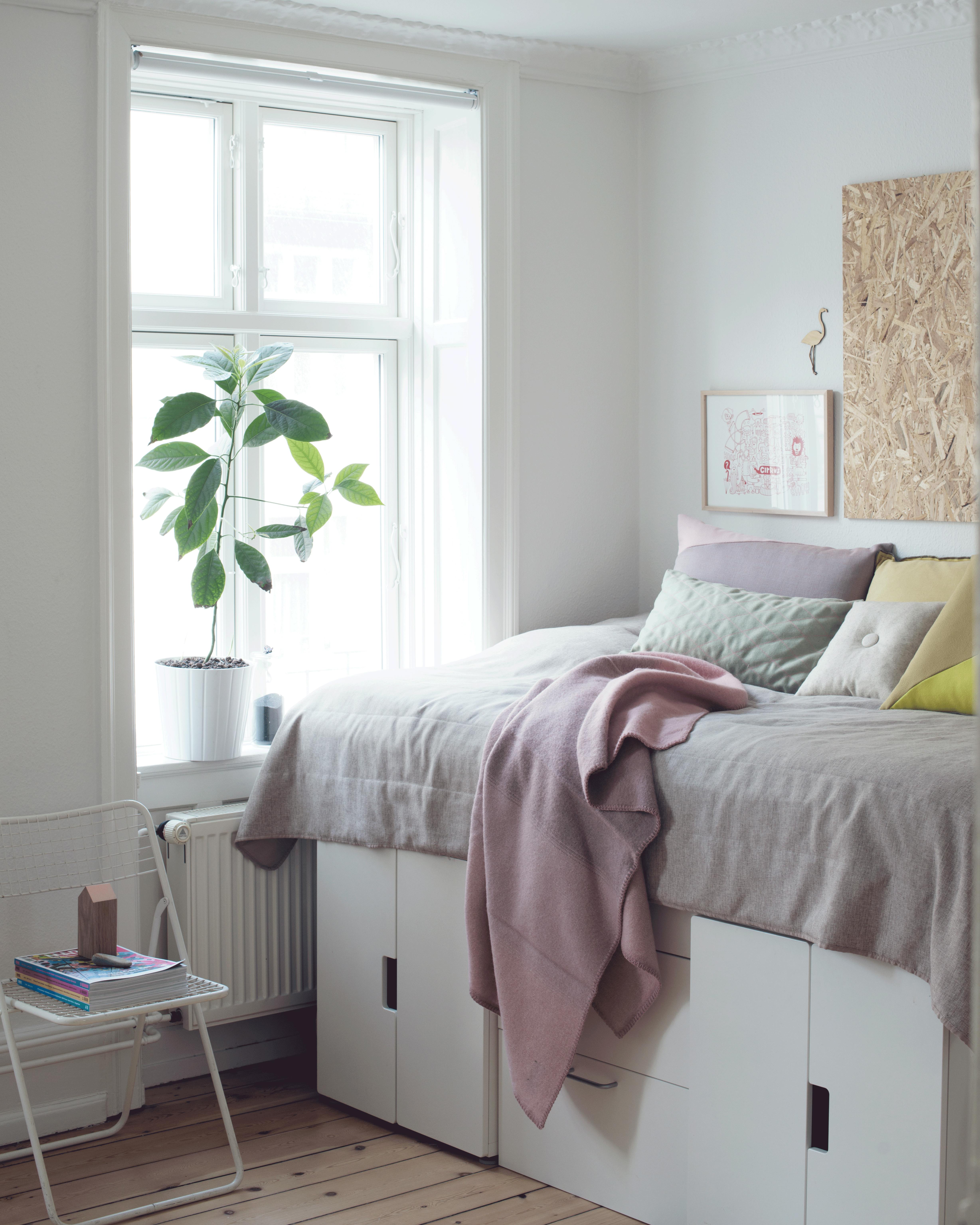Hvis du ligesom mange andre ikke har så meget plads, så udnyt den så meget som muligt. Her er en boksmadres lagt ovenpå nogle Stuva-skabe fra Ikea og nogle små kommoder. Madrassen hviler i den anden ende på en bjælke.