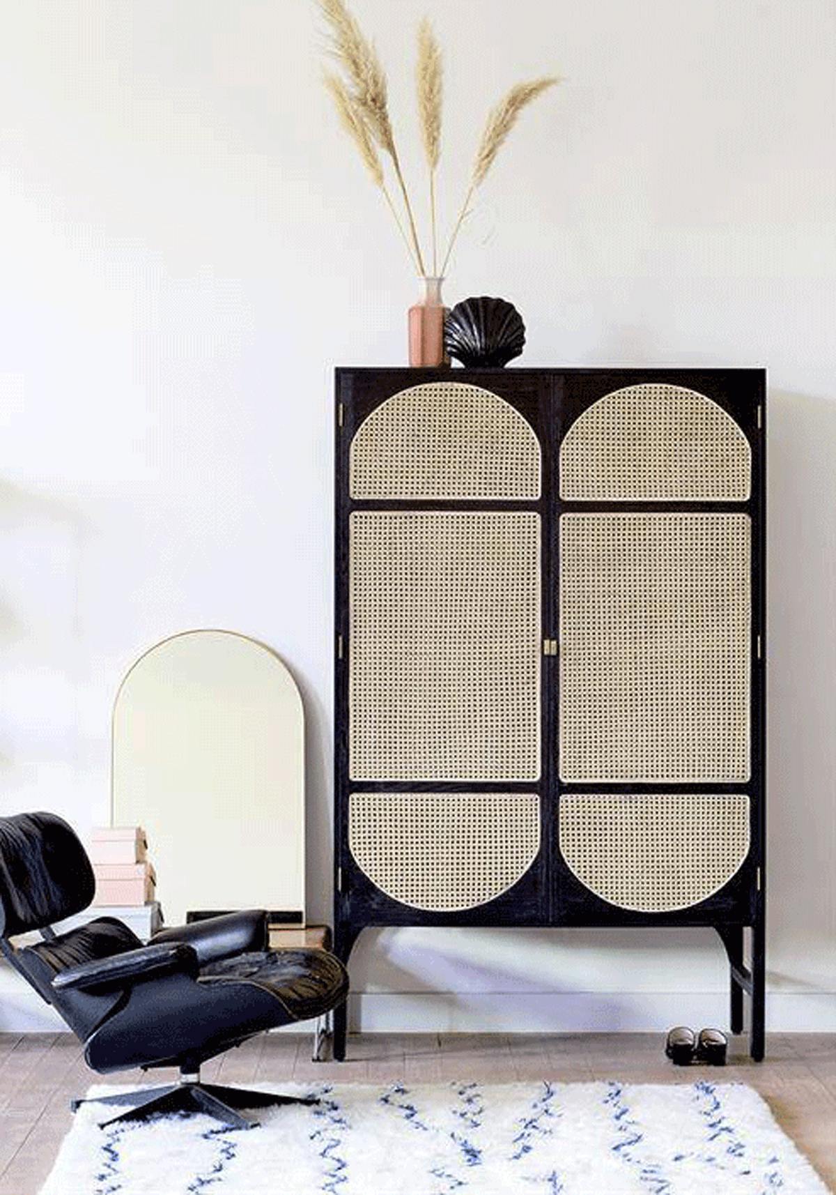 Dette klædeskab i flet fra HK Living har fået et ekstra tvist i form af den sorte farve. Det giver den et mere nutidigt udtryk. Skabet passer perfekt til en mindre garderobe eller til entréen.