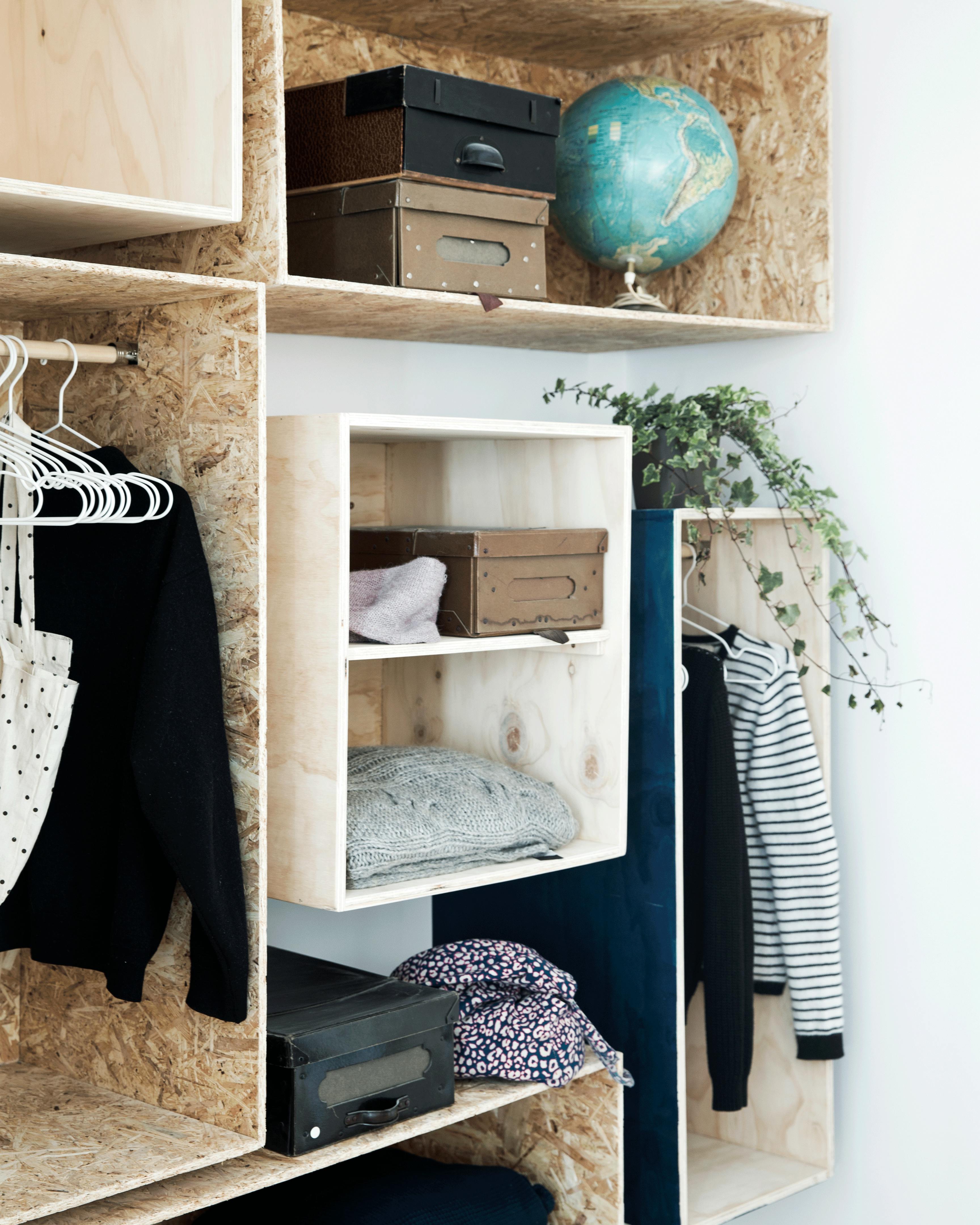 Mix bogkasser og kasser af OSB-plader på væggen. Kasserne giver et godt overblik, og samtidig giver de rummet masser af personlighed.