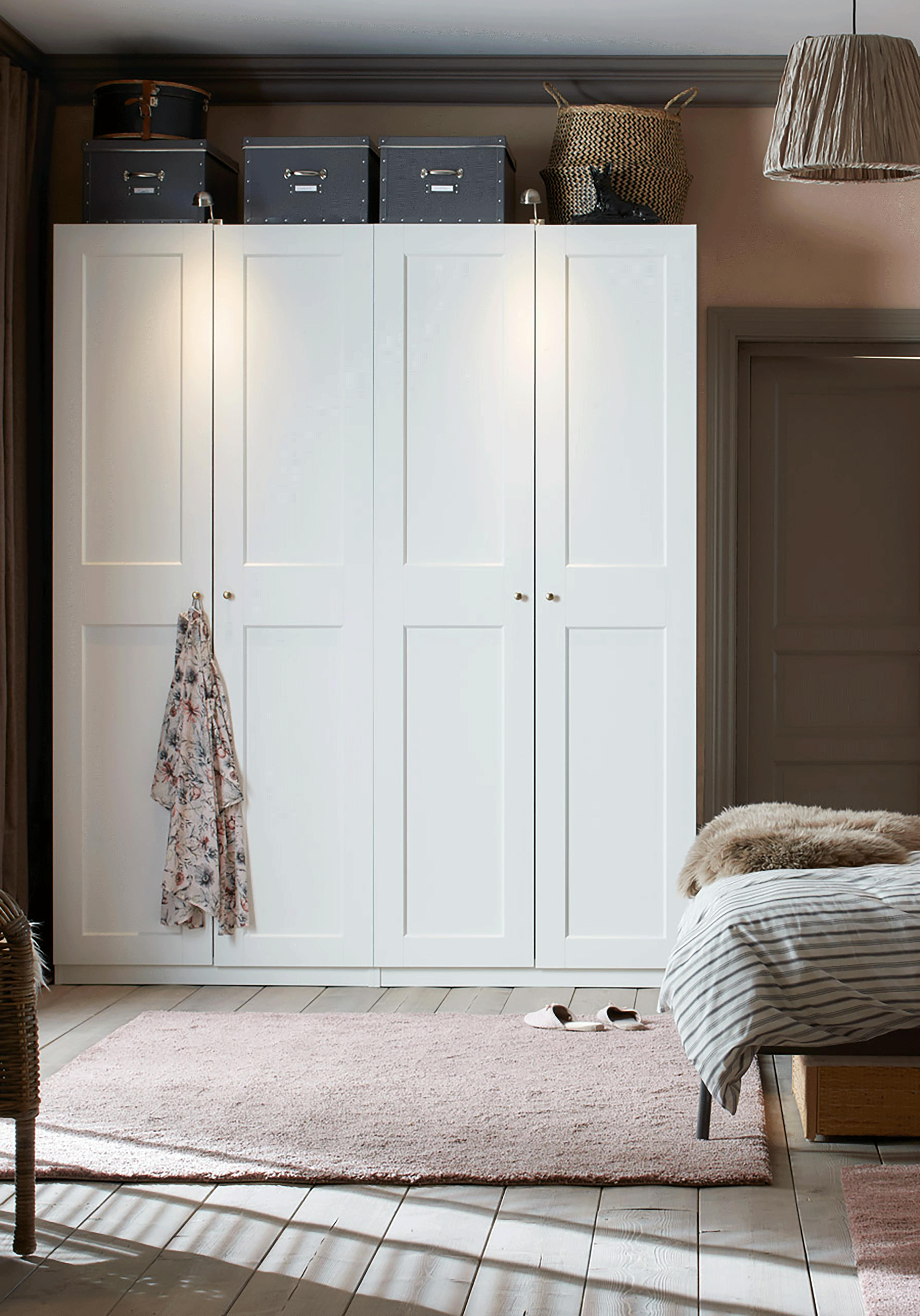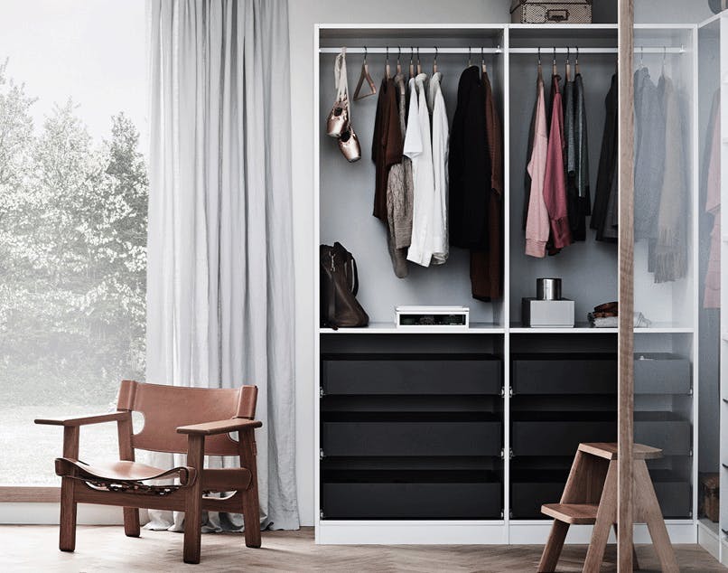 Det hvide garderobeskab er et sikkert valg. Der er som sagt uendelige løsninger med et PAX-garderobeskab. Vælger du et hvidt garderobeskab, kan det være en god idé at omgive det med farver, så udtrykket ikke bliver for sterilt.