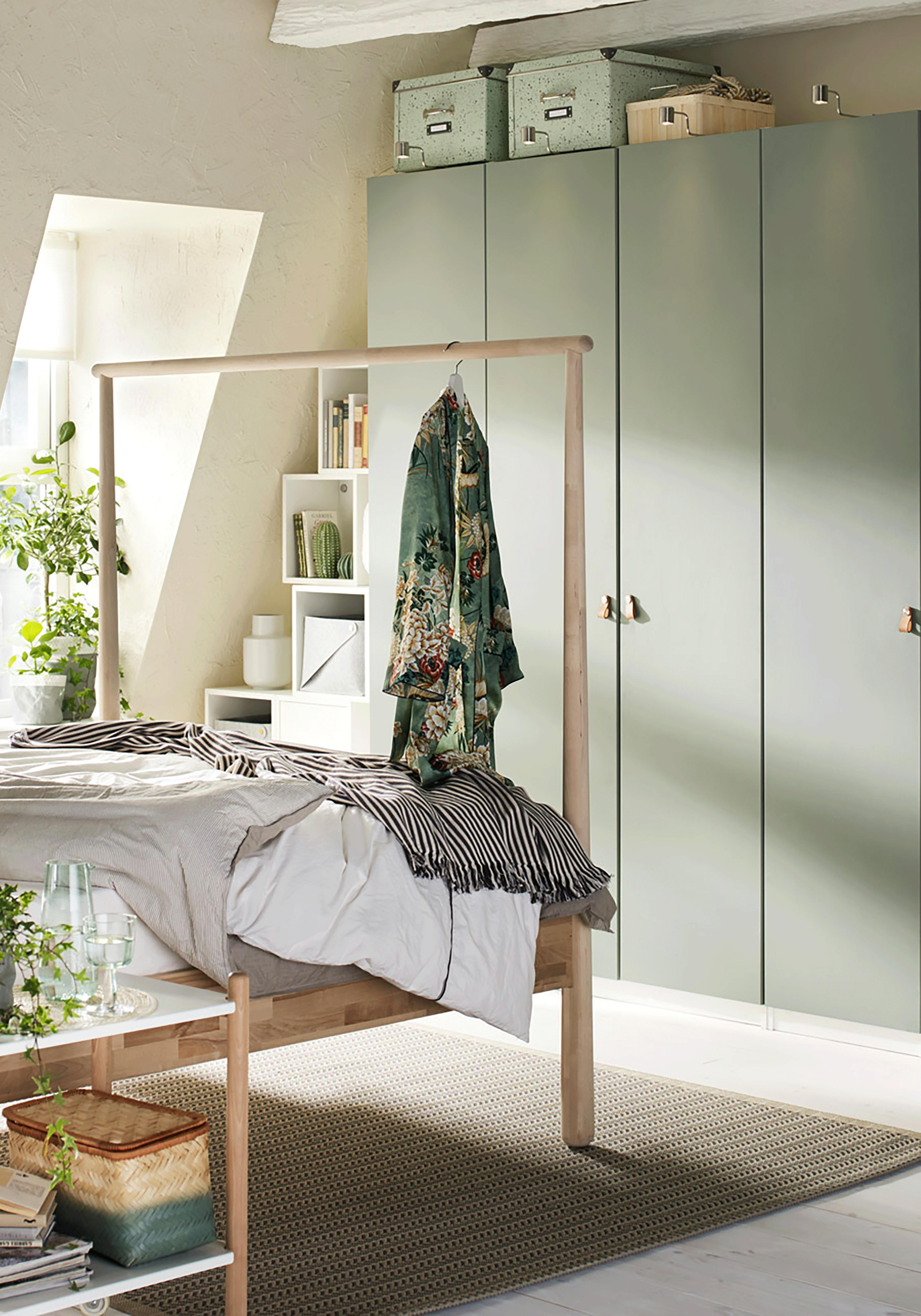 PAX-skabet kan fåes i mange forskellige farver. Gør ligesom her, og vælg et farverigt garderobeskab, der komplimenterer de andre farver i rummet. Vælg nogle utraditionelle greb for at give garderobeskabet et anderledes udtryk.
