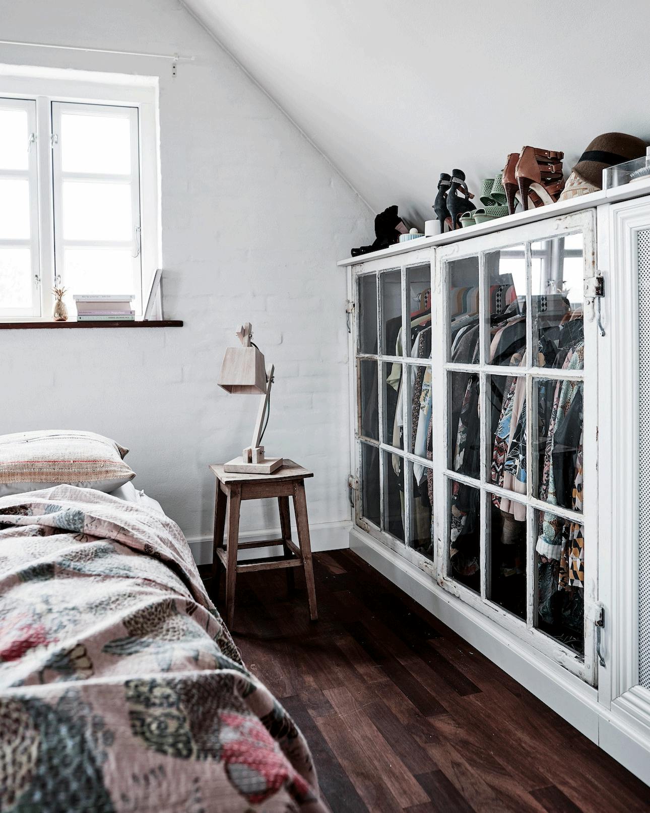 Hvis du gerne vil have et vitrineskab, der passer lige præcis til dine behov, kan du bygge det selv. Vitrineskabet her, der har genbrugsvinduer, er tilpasset skråvæggene, og så kan man oven i købet bruge øverste del som skohylde.