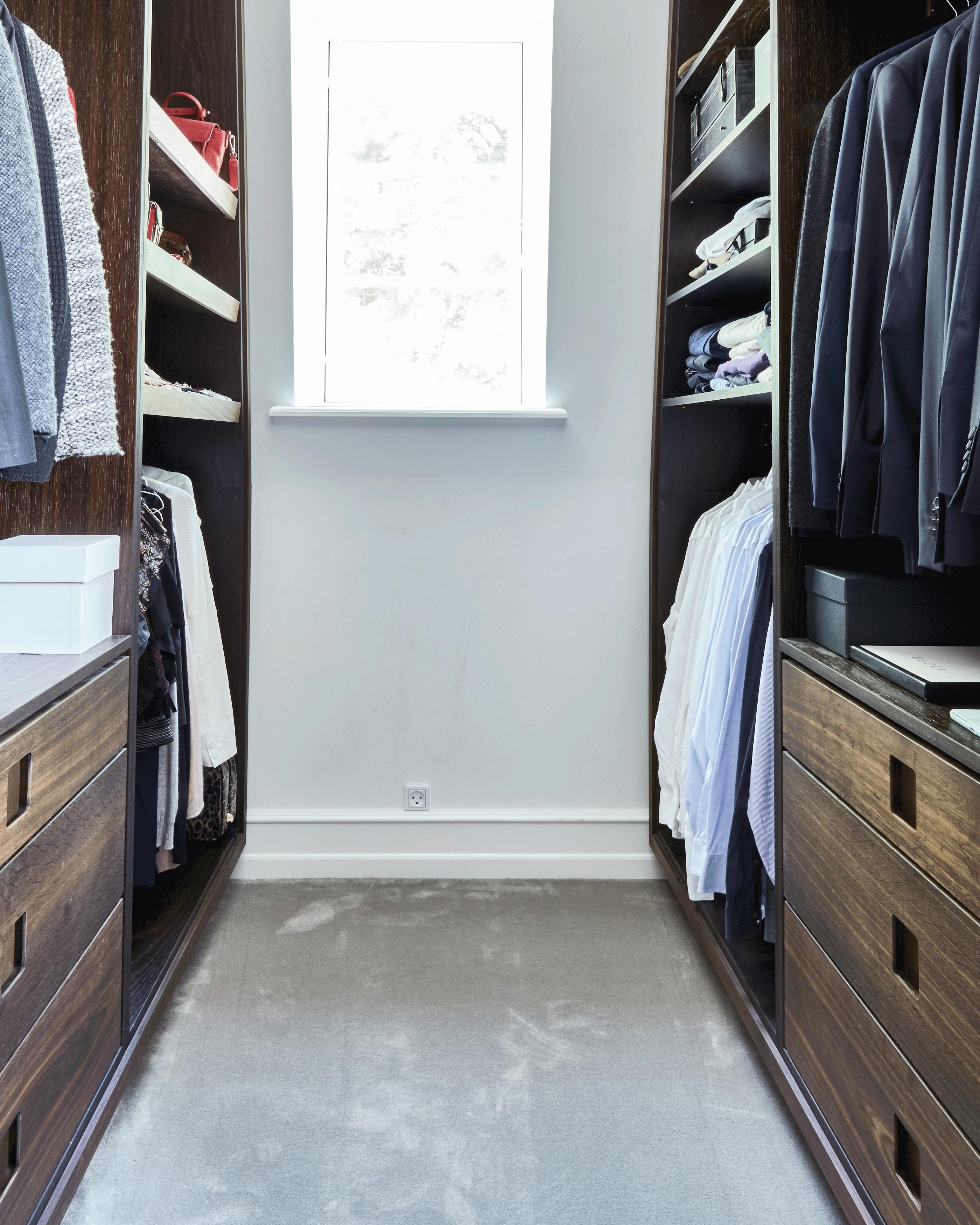 Ofte er walk in-closets hvide, men et mørkt et af slagsen kan være lige så stilfuldt. Hvis du sørger for at beholde en hvid væg og lade masser af lys komme ind, kan det mørke træ skabe en smuk kontrast. Det er firmaet Simonsen og Czechura, der står bag dette walk in-closet.