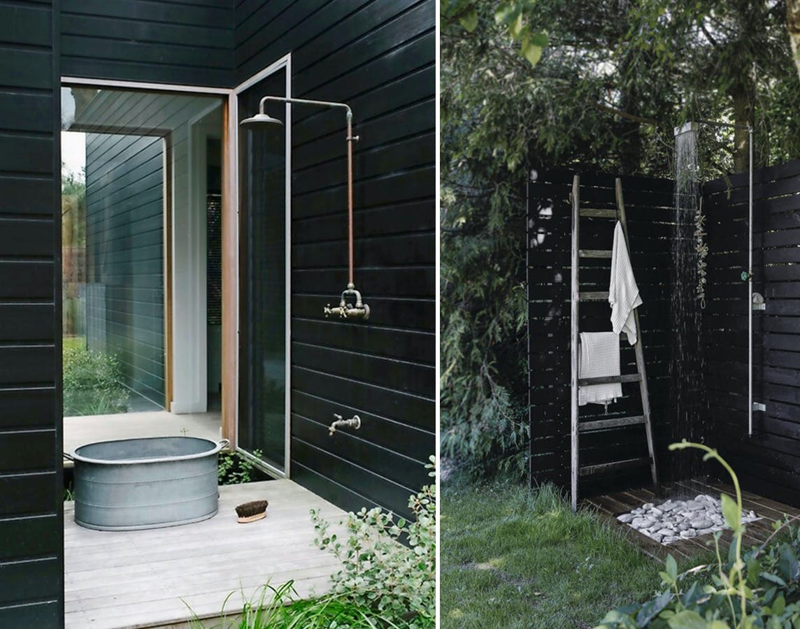 Hvis du allerede har en dejlig terrasse, kan du sagtens placere et udendørsbrusebad dér med en balje til at opsamle vandet. Her bliver bruseren en dejlig integreret del af terrassen, hvor du hurtigt kan tage en skyller.
