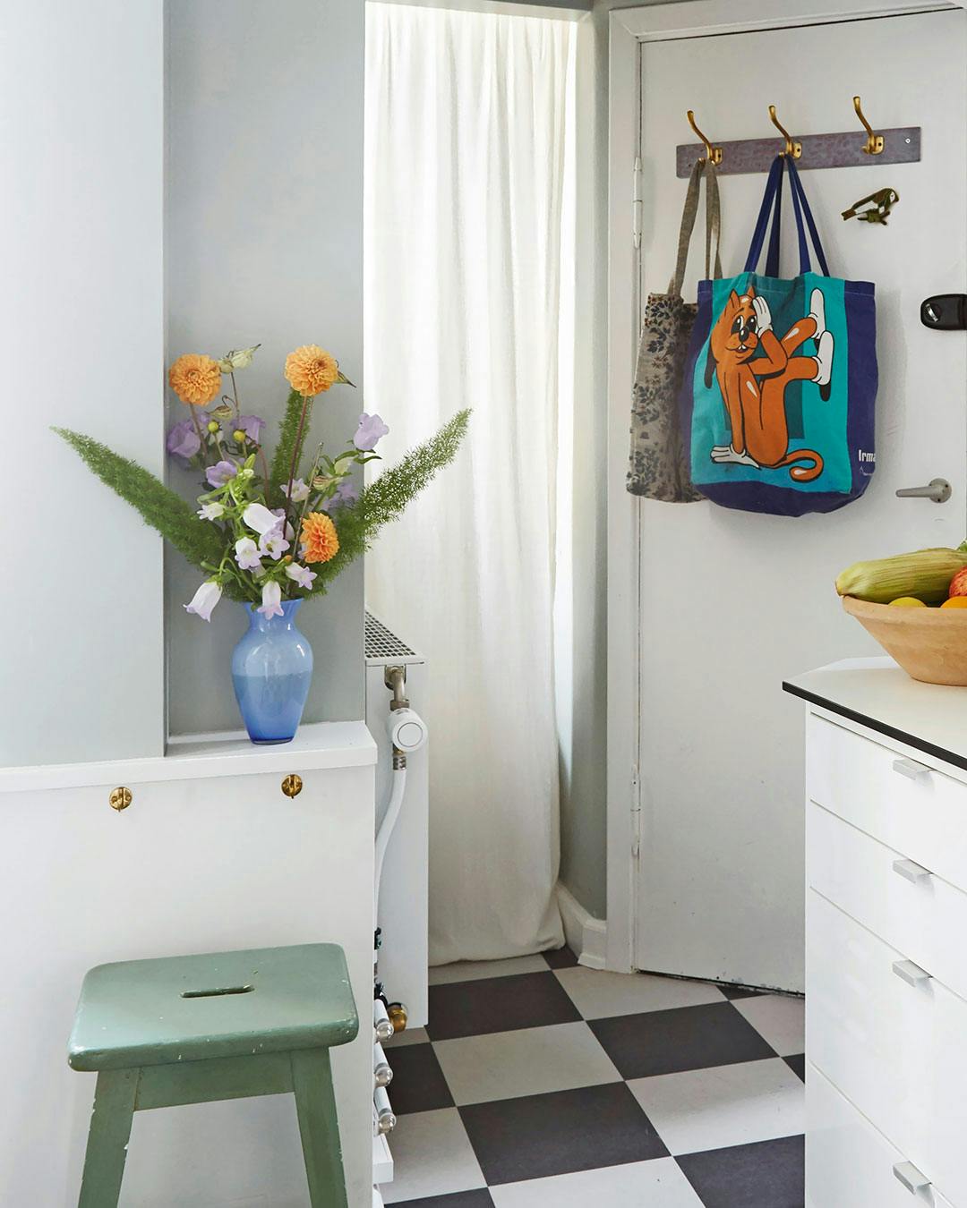 En farvestrålende vase med friske blomster, en skammel i en frisk farve og et indkøbsnet, der har fået plads på døren, giver et neutralt, hvidt køkken et helt nyt udtryk.