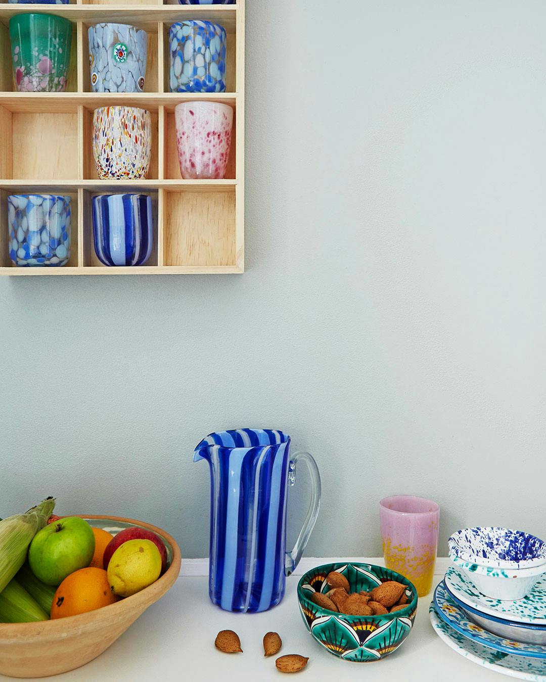 Hvis du samler på finurligt og dekorativt service, er det bare med at få det ud af skabene og frem i spotlyset. En enkelt hylde med dine favoritkopper eller -glas sætter nemlig med ét farverigt fut under køkkenet. Glassene på billedet her er en blanding af Moro Moro, Murano-vintagefund og FindersKeepers-køb. Keramikken på bordet er fundet forskellige steder på Sicilien, og skålen er mexicansk. Kanden er en mundblæst Murano, og sættekassen er fra Søstrene Grene.