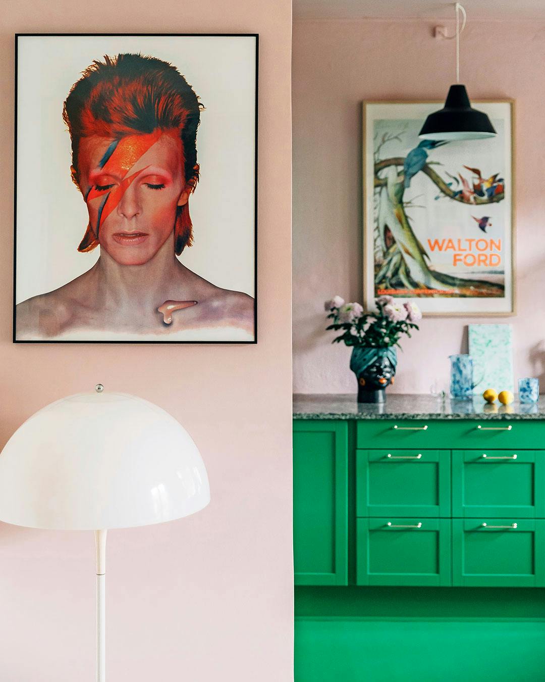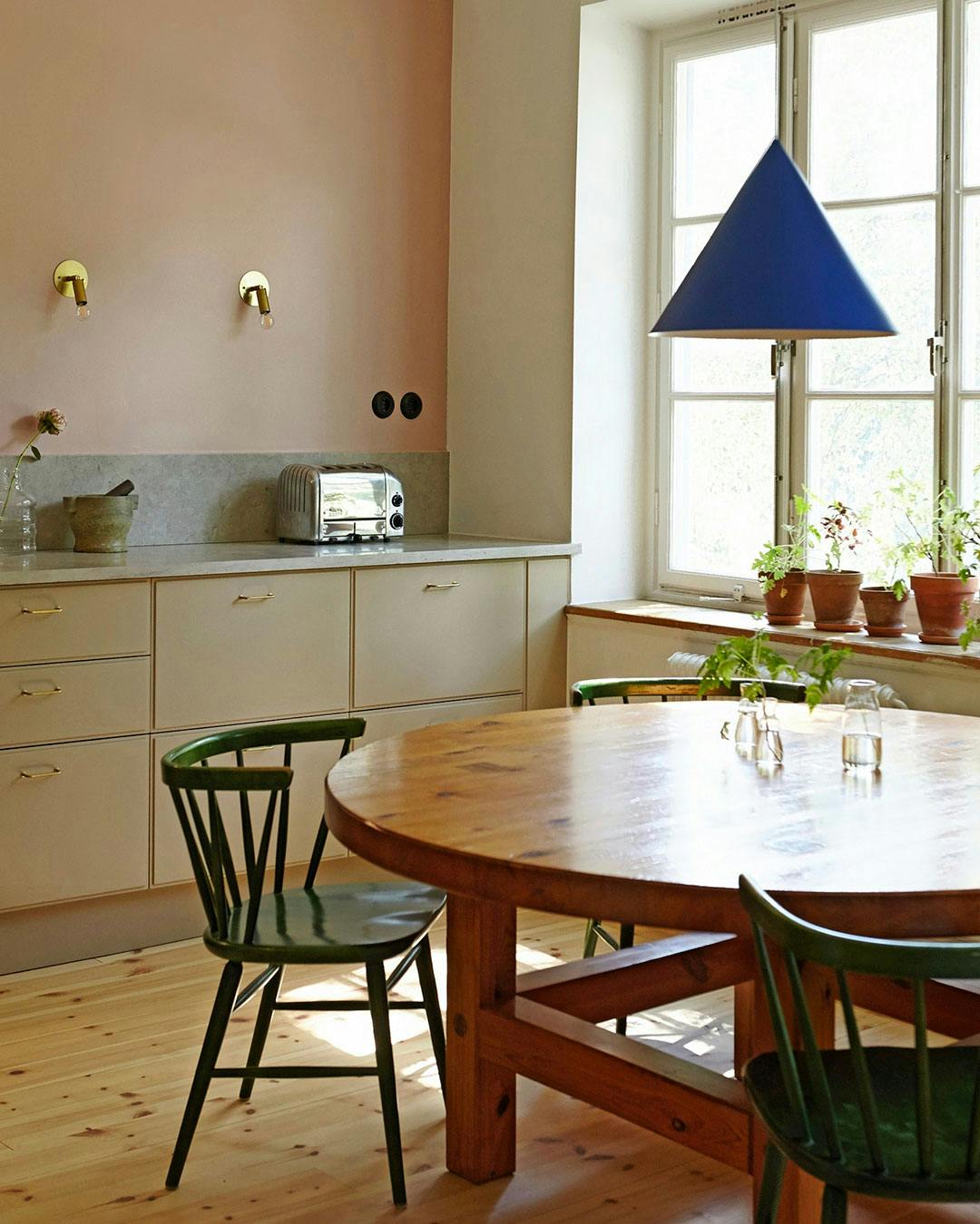 En sart lyserød nuance kan give dit neutrale køkken karakter, uden at det kammer over. Gå også gerne efter et par klare farver til at bryde det ferske udtryk op – som her, hvor den blå lampe giver modspil til de lyse toner. Både køkken og lampe er fra Stilleben.